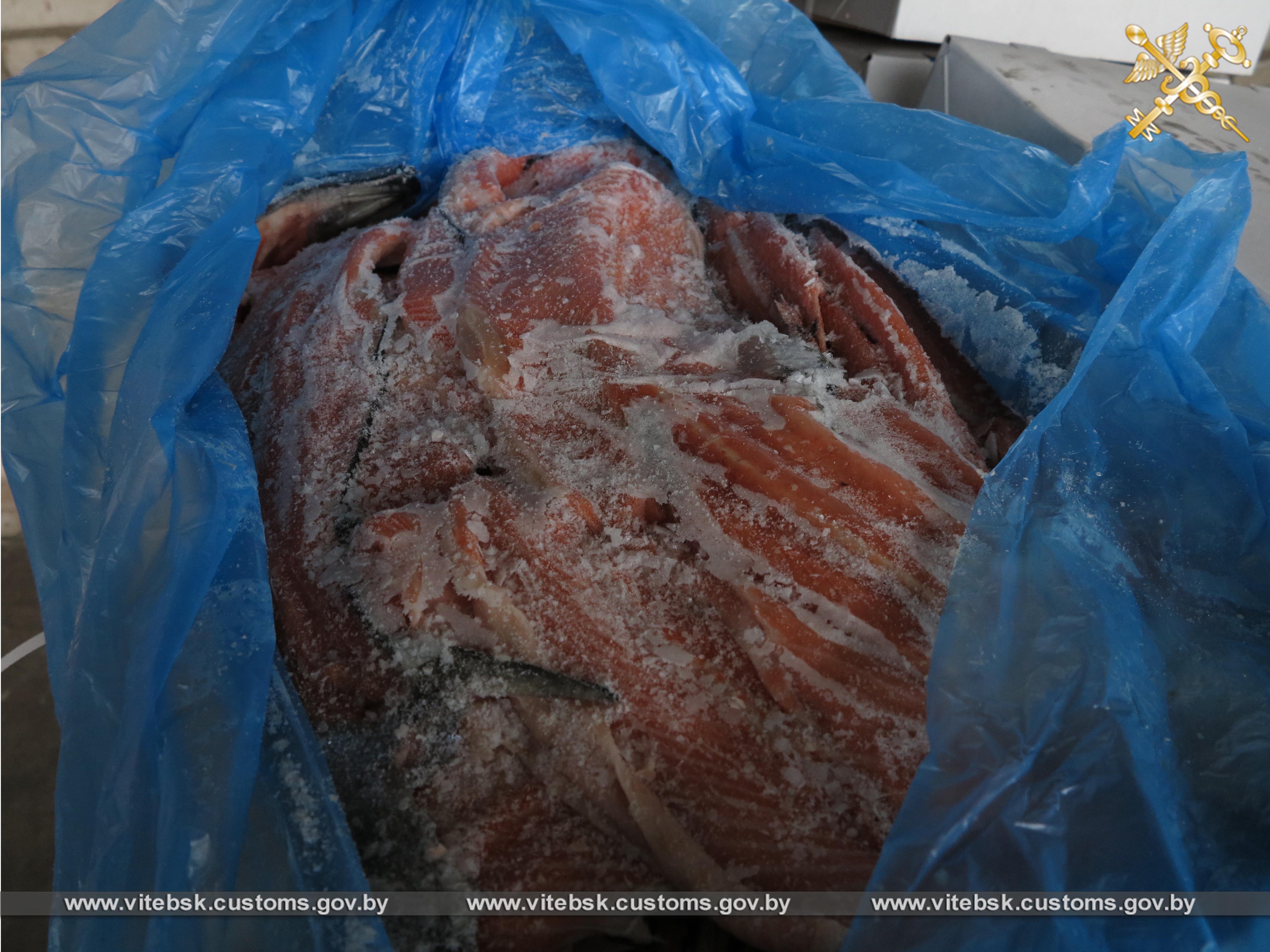 При осмотре автопоезда обнаружено всего лишь три коробки с указанным в документах товаром. Во всех остальных перевозились мороженные хребты и брюшки лосося, запрещенные к ввозу в Россию.