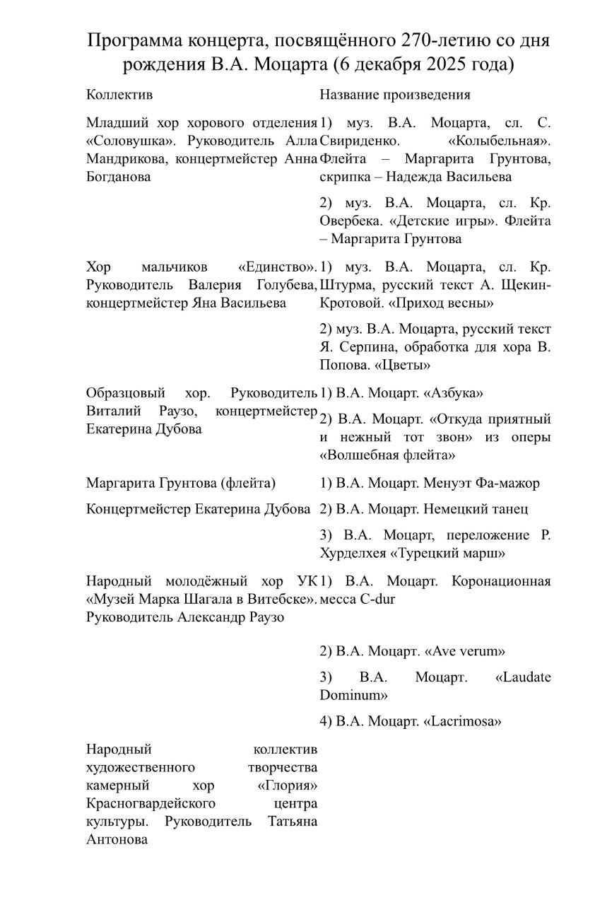 3 декабря / «Витьбичи» / Екатерина Пучкова /. К 270-летию со дня рождения Вольфганга Амадея Моцарта в Витебском государственном музыкальном колледже имени И. И. Соллертинского пройдет праздник хоровой музыки. Прозвучат «Коронационная месса C dur» (до мажор) и другие сочинения великого композитора.