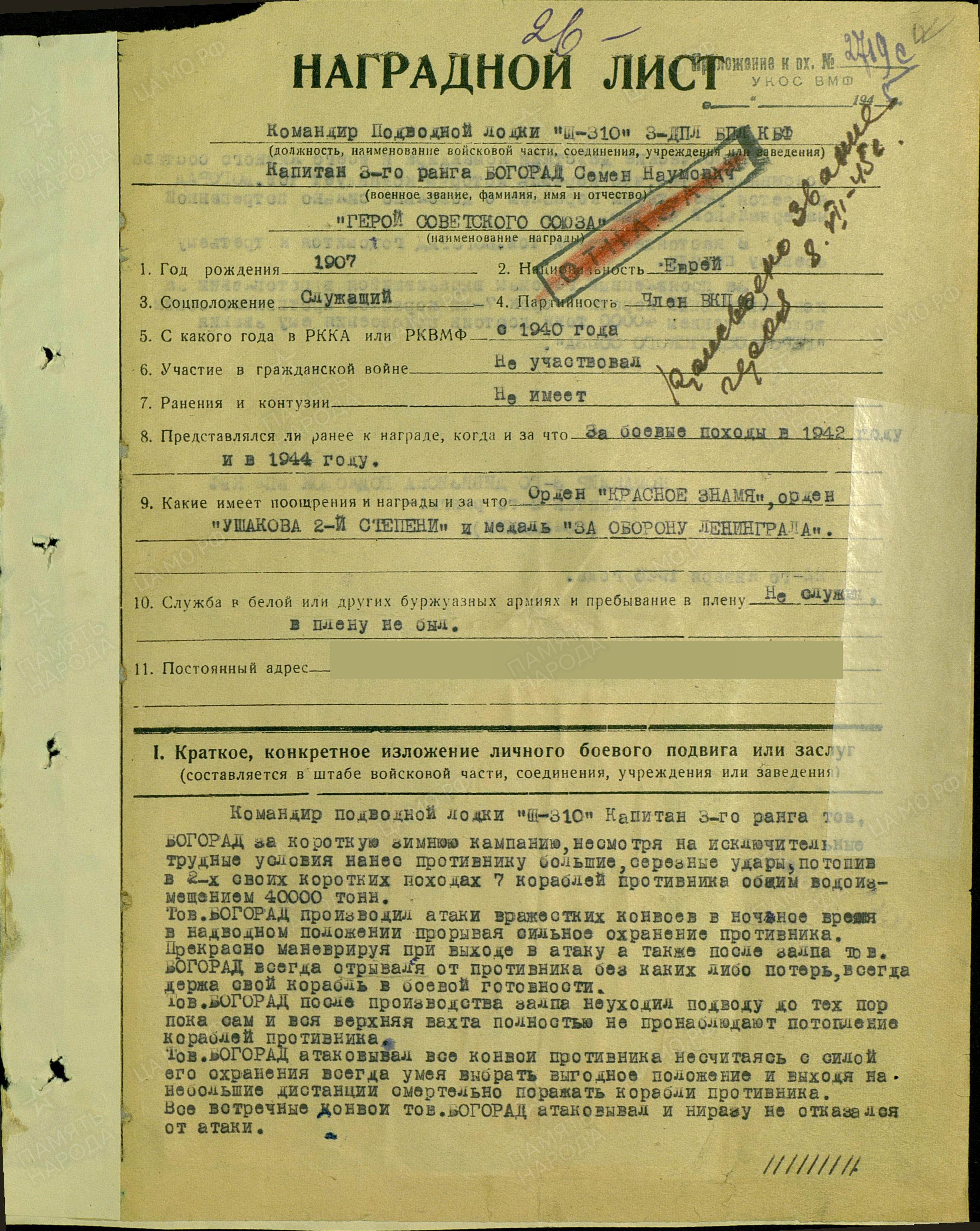 «Щука» под командованием Самуила Нахмановича совершила три боевых похода, провела в море 103 суток, потопила 8 транспортов и один сторожевой корабль врага. В марте 1945-го Щ-310 была награждена орденом Красного Знамени. К этому времени сам командир был уже кавалером двух орденов Красного Знамени, орденов Ушакова II степени, Отечественной войны I степени, Красной Звезды.