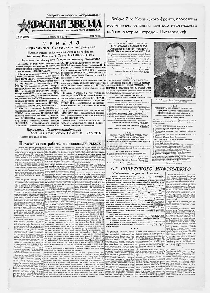 - Воины 4-го Украинского фронта продолжали вести Моравско-Остравскую наступательную операцию, создавая условия для успешного продвижения в центральную часть Чехословакии. 2-й Украинский очистил от фашистов ряд населенных пунктов Австрии.