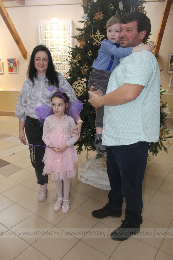 Семья Константина и Ольги Прозоровых с тремя детьми приехала в Витебск из Донецкой области, где до сих пор неспокойно, раздаются взрывы и выстрелы. Для их младшего ребенка Ивана – это первая мирная ёлка и первый настоящий Дед Мороз со Снегурочкой, которые приходят к детям с полным мешком подарков. Малыш с удовольствием сфотографировался возле зелёной нарядной красавицы со старшим братом Костей и сестрой Кирой. Их привлекли соломенные игрушки, которыми в колядных традициях была украшена ёлка. Ребята решили, что обязательно научатся их мастерить. Глава многодетной семьи Прозоровых работает на Витебской железной дороге, к тому же родители и дети получают поддержку от Белорусского Красного Креста. Они надеются на новую счастливую жизнь, и строят ее своими руками.