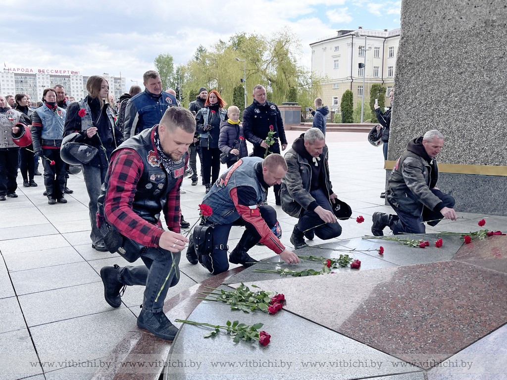Мотолюбители прибыли к мемориальному комплексу в честь советских воинов-освободителей, партизан и подпольщиков. В знак благодарности за мирное небо над головой они возложили цветы к вечному огню.