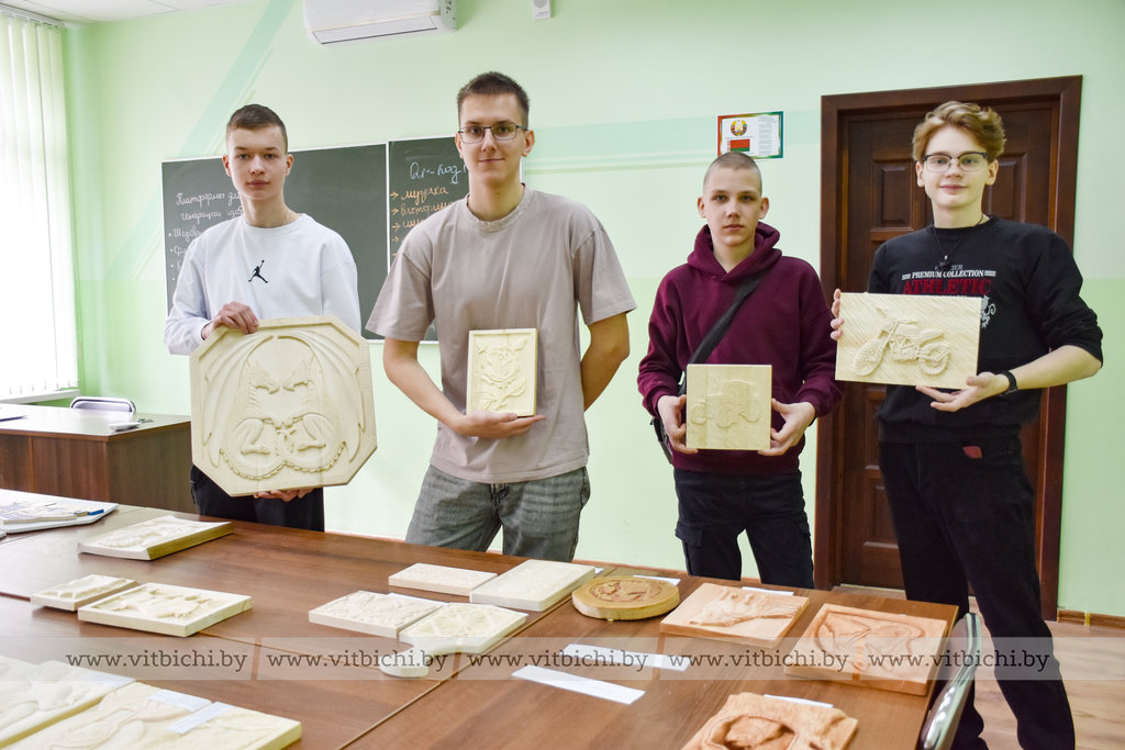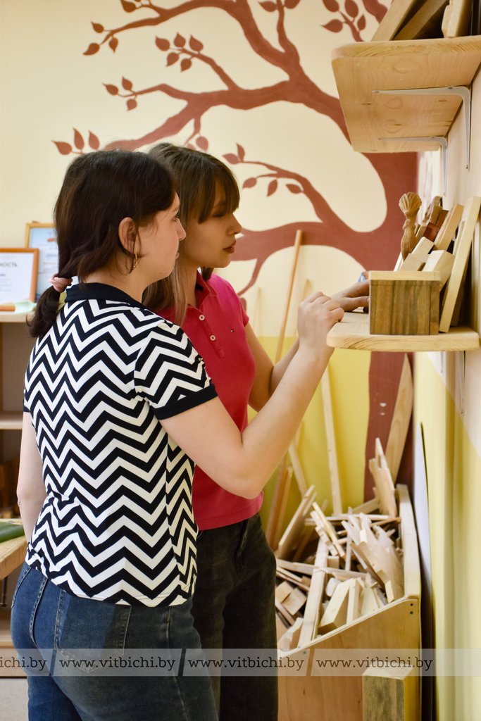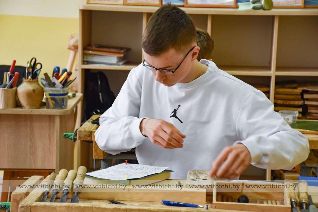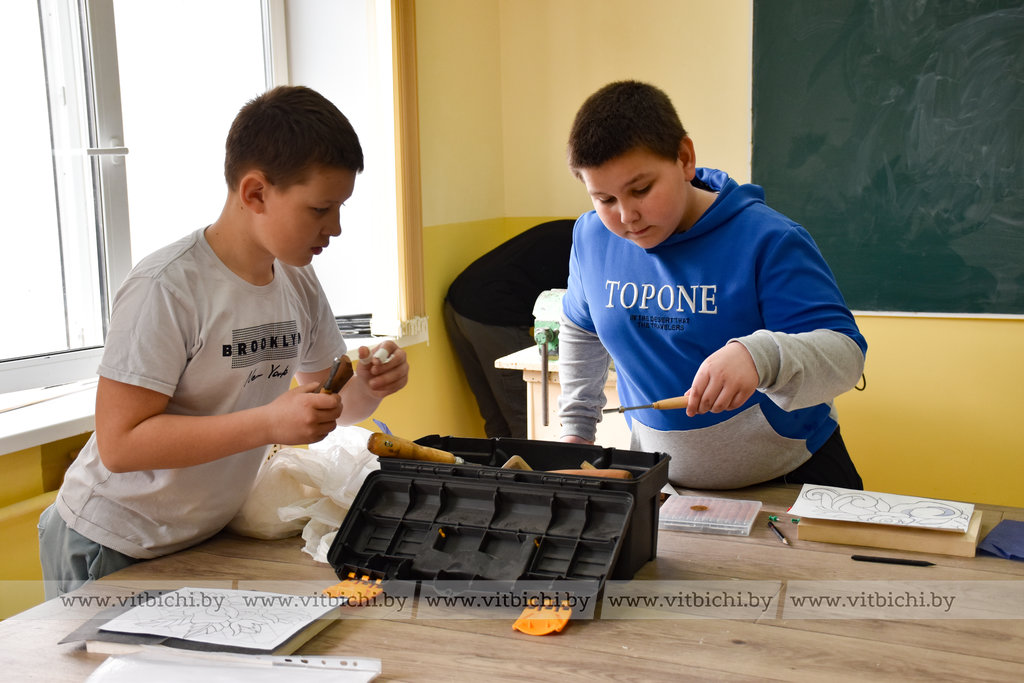 Руслан Сергеевич сам занимается деревообработкой более 10 лет и интерес к этому увлекательному занятию старается прививать своим учащимся. В объединении по интересам «Резьба по дереву» у него занимаются как мальчики, так и девочки. Причем последние, Екатерина Шляхто и Дарья Дадеко из агрогородка Бабиничи, делают успехи. Их умелые руки за год уже изготовили из дерева самые разные изделия: подставки под кружки, ложки, фигурки животных и птиц, ключницы, а также самые разнообразные панно. Девочки ловко выбрали себе инструмент и приступили к работе над своими эскизами. Они, как и другие учащиеся, нацелены на победу.