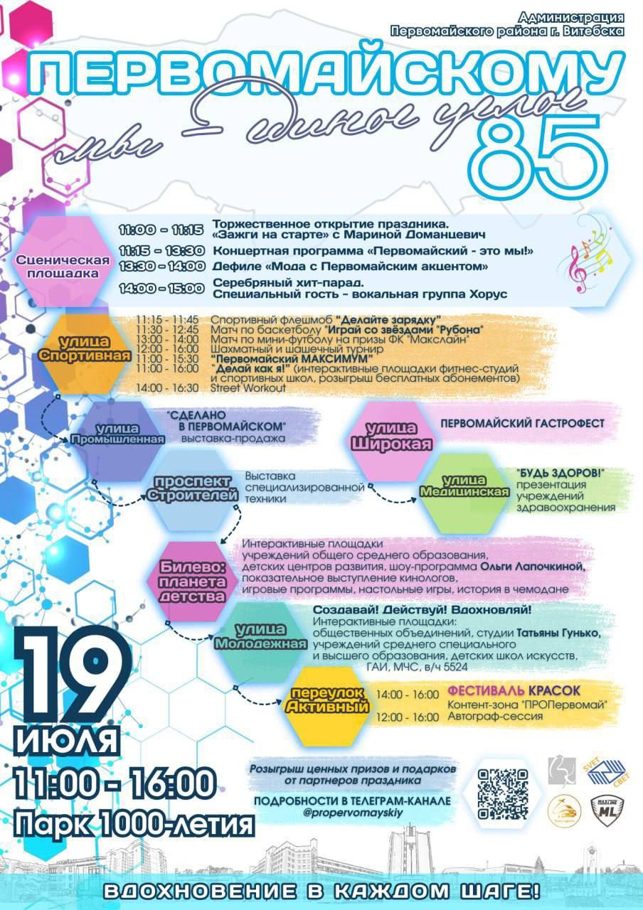19 июля в парке 1000-летия Витебска состоится масштабное мероприятие, посвященное 85-летию Первомайского района! Это будет яркий, динамичный и по-настоящему объединяющий праздник — с насыщенной программой, творческими активностями, выступлениями лучших артистов и множеством сюрпризов.
