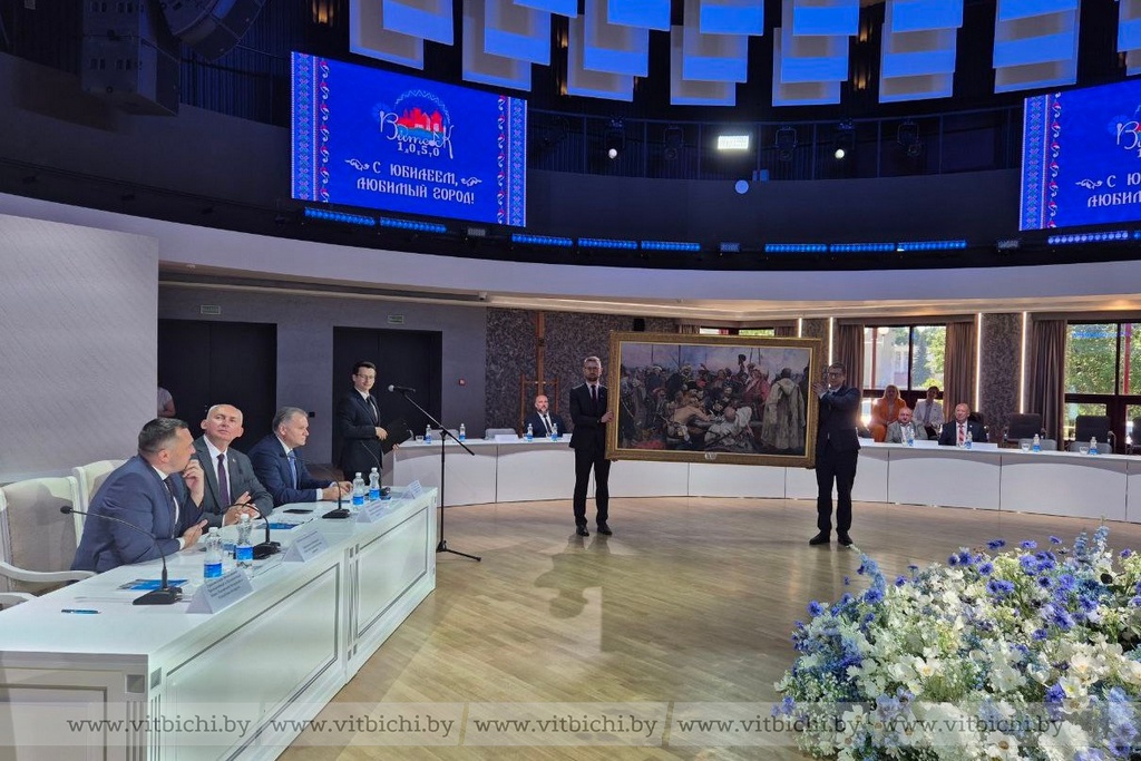 Чрезвычайный и Полномочный Посол России в Беларуси Борис Грызлов передал Витебску ценнейший подарок - официальную, полностью сертифицированную рукописную копию легендарного полотна Ильи Репина «Запорожцы», выполненную лучшими мастерами Союза художников России.