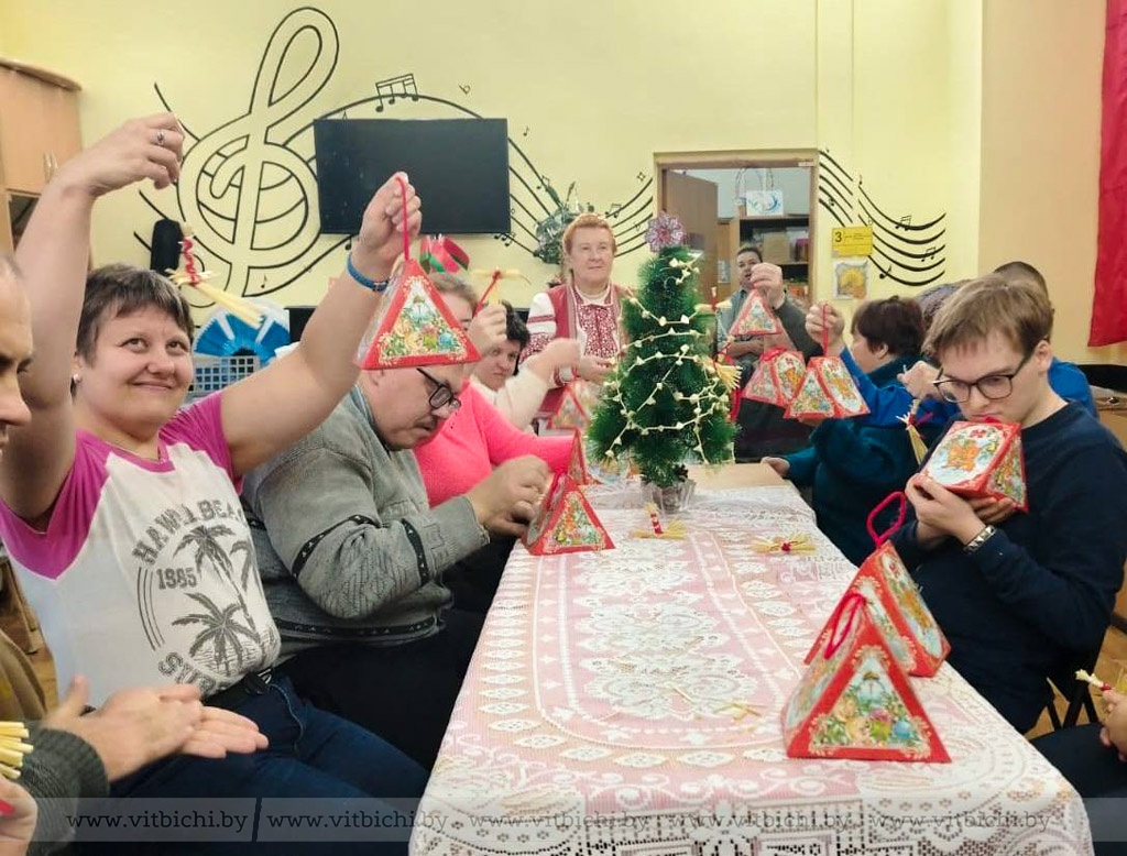 Молодые люди с ограниченными возможностями аккуратно и кропотливо нанизывали на нитку соломенную бусинку и, чередуя с тоненькой трубочкой, передавали друг другу золотистые бусы, которые на глазах становились длиннее. Потом сообща украсили ими ёлку. А лично для себя каждый участник мастер-класса изготовил игрушку-снегиря.
