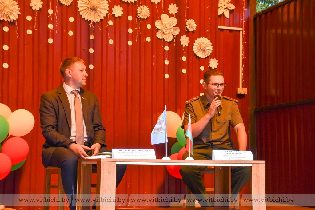 С юношами и девушками встретился начальник отдела призыва на военную службу военного комиссариата города Витебска, Витебского и Лиозненского районов Александр Ахрамович и начальник отдела идеологической работы и по делам молодежи, спорта и туризма администрации Первомайского района Павел Шлык.
