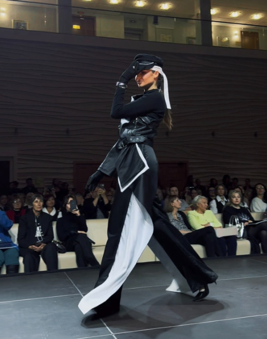 «Это не бунт, а элегантная мощь. Классические силуэты в моей коллекции встречаются с бунтарскими байкерскими элементами, а черный и белый цвета олицетворяют единство противоположностей. Моя героиня говорит не криком, а уверенным шепотом», — поделилась концепцией Полина Купреенко.