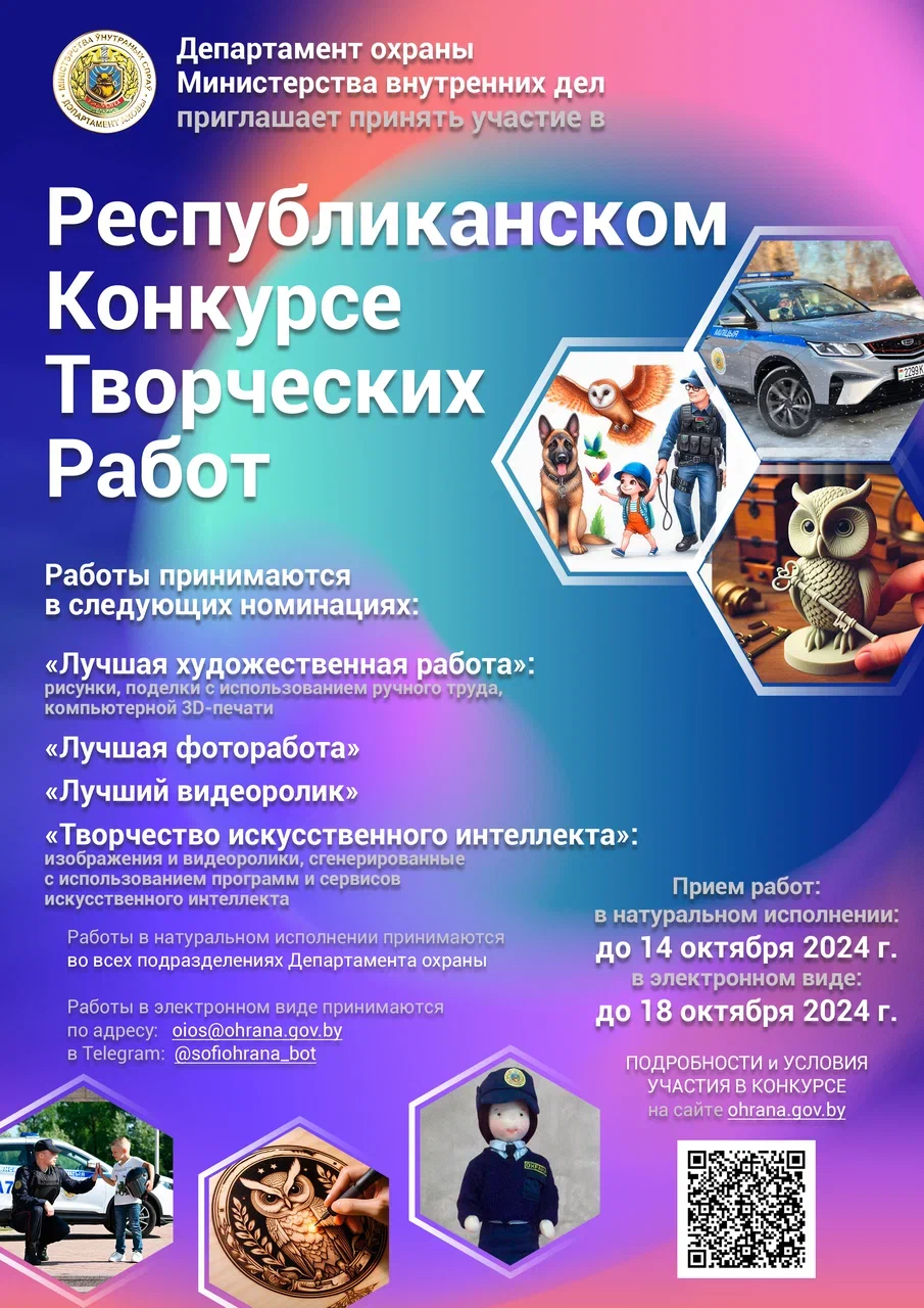 Работы в натуральном исполнении принимаются до 14 октября 2024 г. во всех подразделениях Департамента охраны, в электронном виде до 18 октября 2024 г. по адресу: oios@ohrana.gov.by в Telegram: @sofiohrana_bot