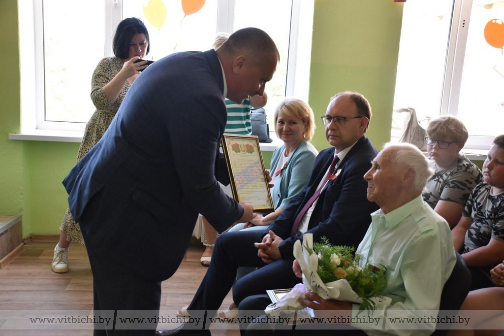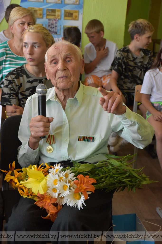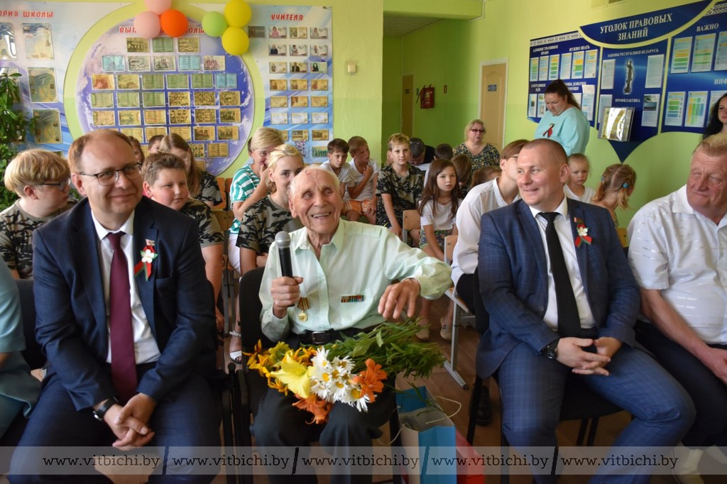 Председатель Витебского райисполкома Сергей Егоров вручил благодарственное письмо от райисполкома и поздравительную открытку от председателя Витебского облисполкома Александра Субботина. Он также поблагодарил за героизм в военные годы и напряженный труд в мирное время.