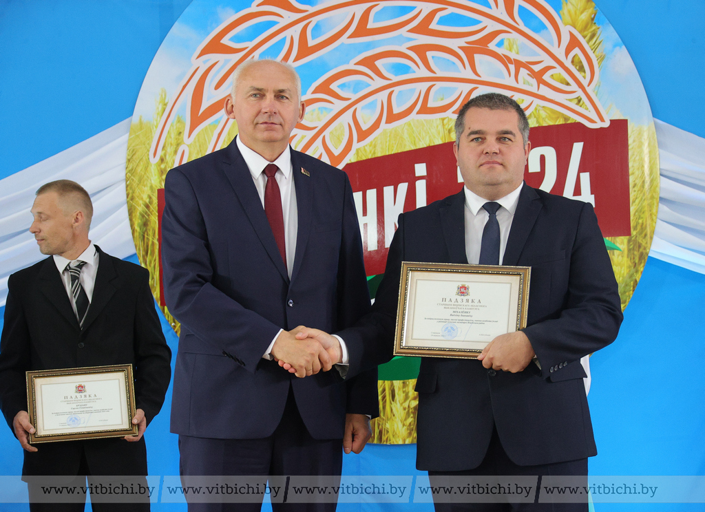 Первый заместитель председателя Витебского облисполкома вручил благодарности облисполкома героям жатвы.