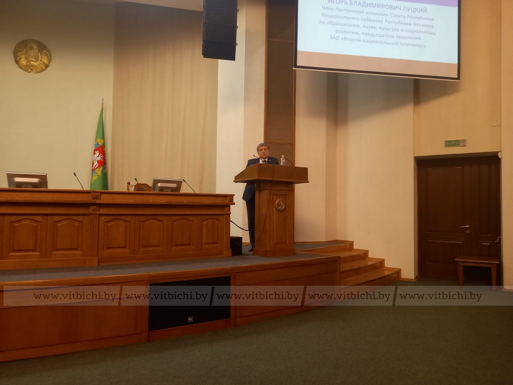 22 апреля / «Витьбичи» / Виталий Сеньков /. В рамках единого дня информирования по теме «Подвигу народа жить в веках» председатель правления ЗАО «Второй национальный телеканал» член Постоянной комиссии Совета Республики Национального собрания Республики Беларусь по образованию, науке, культуре и социальному развитию Игорь Луцкий провел встречу с идеологическим активом Витебской области.
