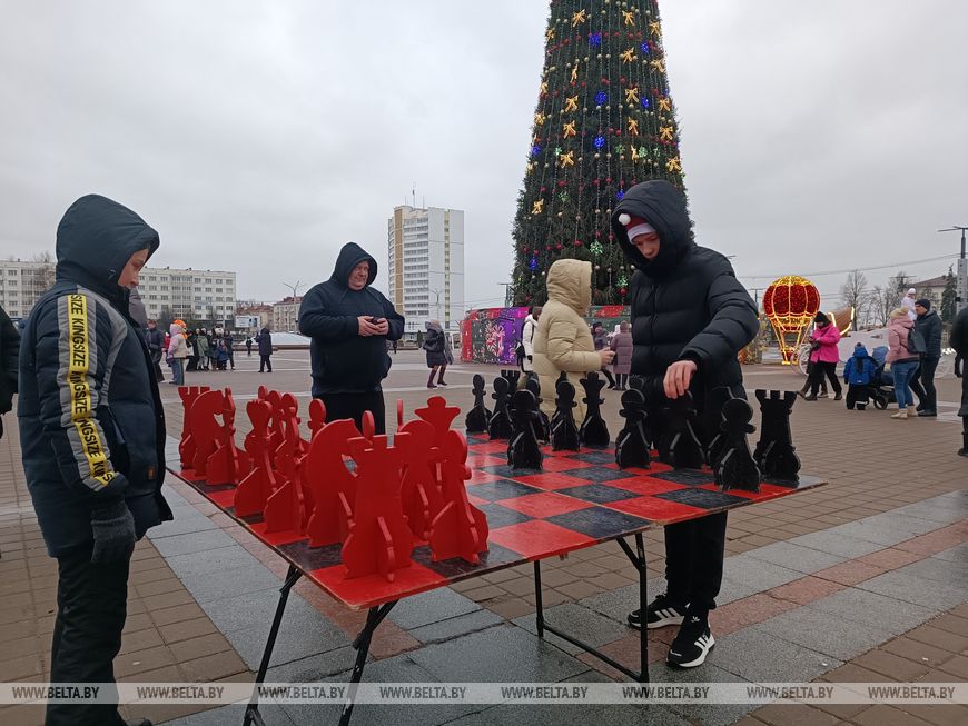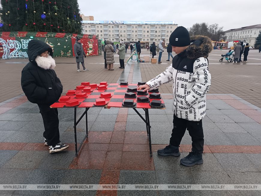 Самые стойкие жители города в первый день нового года пришли прогуляться на центральную площадь города и стали участниками интерактивной развлекательной программы. Для любителей интеллектуальных игр были доступны столы с уличными шахматами, шашками, игрой "Крестики-нолики", а также дженгой. Друг с другом соревновались дети, взрослые, а также смешанные пары, где никто не хотел поддаваться и уступать пальму первенства. За ходом игр наблюдали такие же поклонники тихого спорта и захватывающих игр.