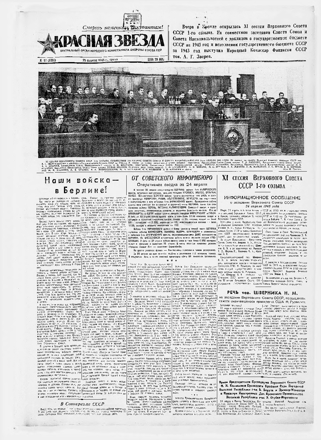 Штурм Берлина вступил в завершающую фазу. В полдень 6-й гвардейский механизированный корпус 4-й гвардейской танковой армии 1-го Украинского фронта форсировал реку Хафель и соединился с частями 47-й армии 1-го Белорусского фронта. Столица нацистской Германии была полностью окружена войсками Красной армии.
