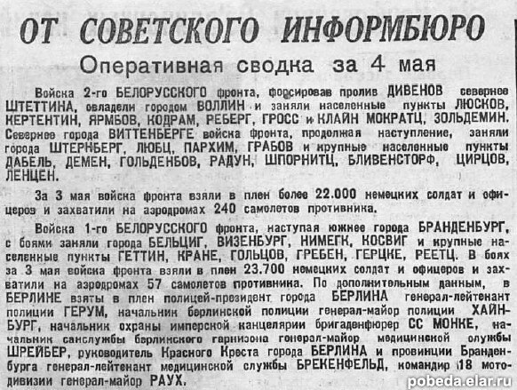- Войска 1-го Белорусского фронта, наступая южнее Бранденбурга, с боем брали ряд городов нацистской Германии.