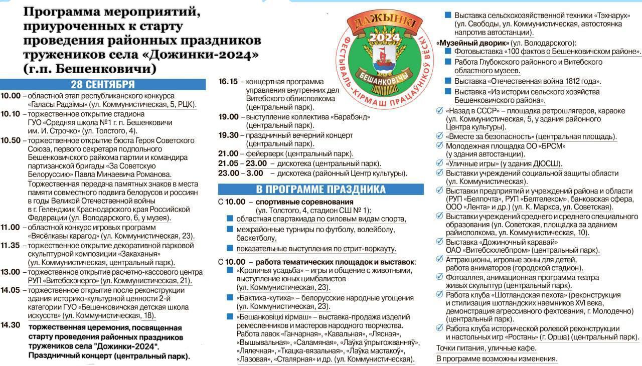 26 сентября/ "Витьбичи"/. Программа мероприятий, приуроченных к старту проведения районных праздников тружеников села "Дожинки-2024" в г.п. Бешенковичи.