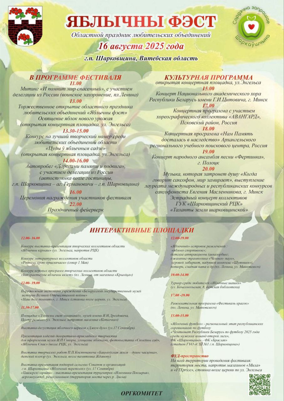 16 августа в городском посёлке Шарковщина пройдёт яркий и вкусный праздник — «Яблочный фэст». Гостей ждёт насыщенная программа с концертами, конкурсами, мастер-классами и, конечно, морем яблочных угощений.
