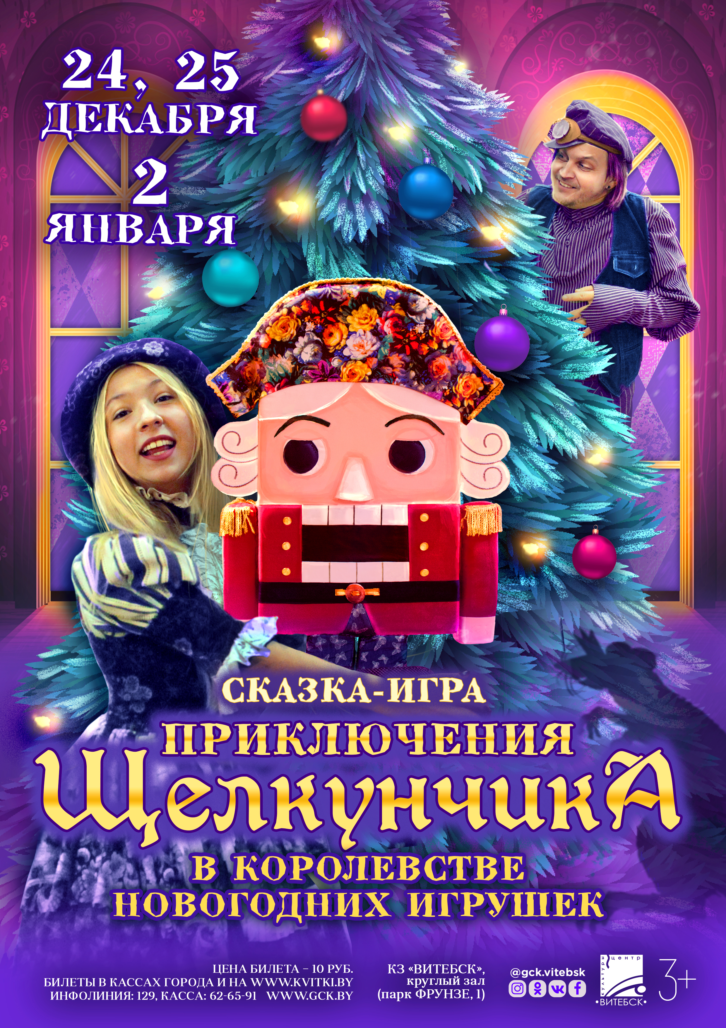 В круглом зале концертного зала «Витебск» в предновогодние дни, с 24 декабря 2022 года по 2 января 2023 года, для самых маленьких откроются двери в волшебную музыкальную сказку «ПРИКЛЮЧЕНИЯ ЩЕЛКУНЧИКА В КОРОЛЕВСТВЕ НОВОГОДНИХ ИГРУШЕК».