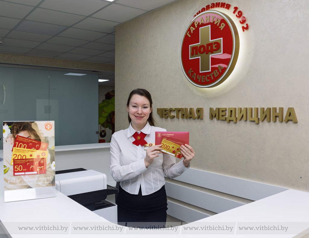 В медицинском центре действует система подарочных сертификатов на сумму 50, 100 и 200 белорусских рублей.
