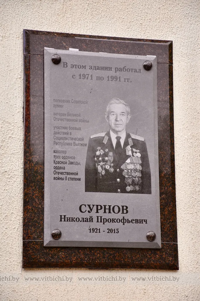 7 мая / «Витьбичи» / Вера Мурашкина /. Мемориальную доску ветерану Великой Отечественной войны, участнику боевых действий во Вьетнаме, полковнику Советской Армии Николаю Прокофьевичу Сурнову открыли сегодня на здании Витебского центра стандартизации, метрологии и сертификации на улице Б. Хмельницкого, 20. Здесь после увольнения в 1971 году из армии в запас ветеран трудился инженером-метрологом еще на протяжении 20 лет.