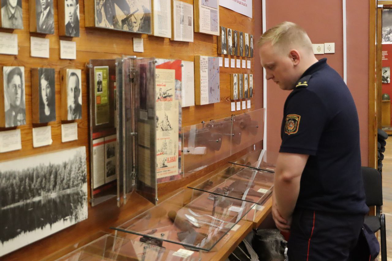 В небольшом здании музея всё оказалось буквально пропитанным духом героического сопротивления белорусского народа и его подвигов. Правоохранители познакомились с экспонатами музея, среди которых вооружение, обмундирование, документы, фотографии, личные вещи Шмырёва и материалы, рассказывающие о боевых действиях отряда «Батьки Миная», а также партизанских бригад против немецко-фашистских захватчиков в Суражской партизанской зоне.
