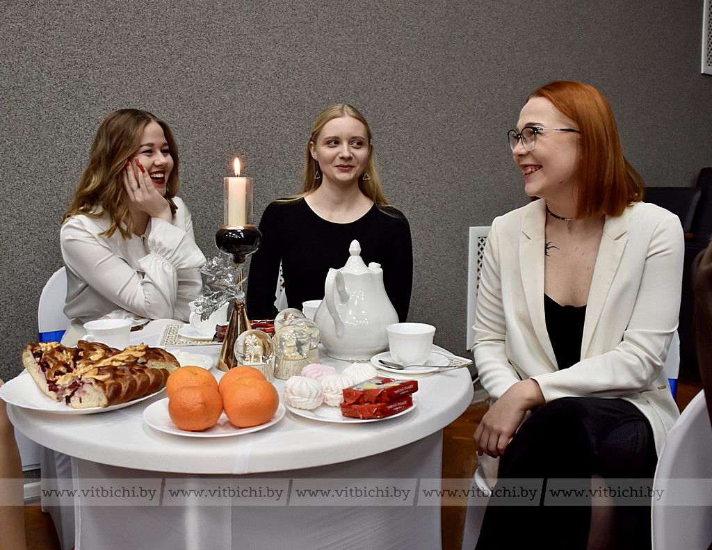 В свою очередь, молодые специалисты рассказали о себе, а также семейных новогодних и рождественских традициях. Так, например семья Екатерина Кривенко обязательно 31 декабря посещает баню и смотрит фильм «Ирония судьбы, или С легким паром!». Окончив ВГУ имени П. М. Машерова, Екатерина была распределена в гимназию № 8, где уже второй год преподает английский язык.