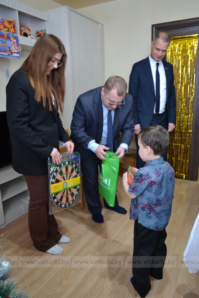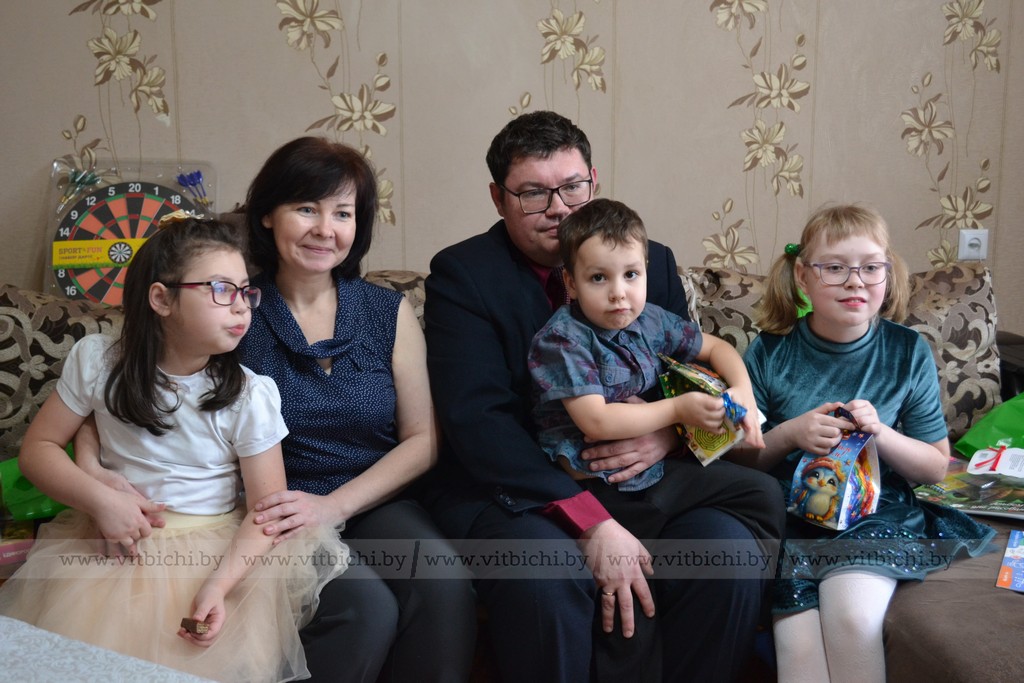 29 декабря / «Витьбичи» / Юлия Прищепа /. Благотворительная акция «Наши дети» продолжается в Витебске. С новогодним визитом глава администрации Октябрьского района Владимир Белевич и начальник отдела по образованию Андрей Похолкин посетили многодетную семью Швейба.