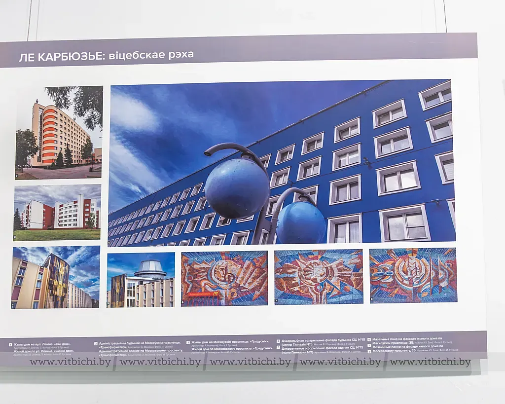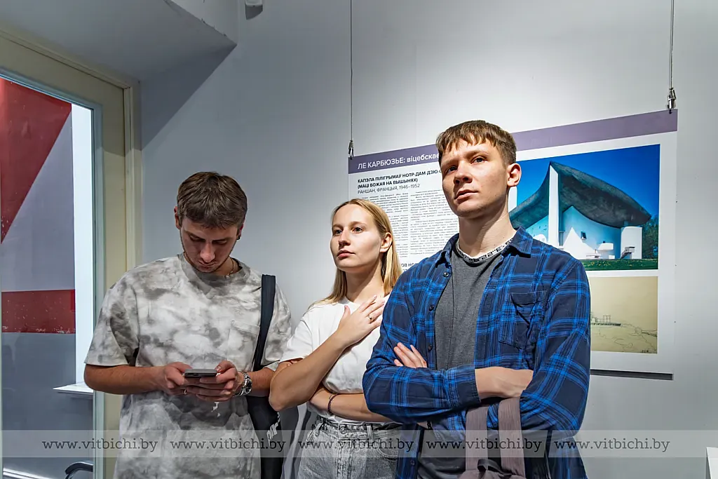 Зодчий никогда не был в Витебске, но «эхо Ле Корбюзье» в современном пространстве города слышно очень отчетливо, утверждают кураторы выставки. Основной прием экспозиции – ассоциативные параллели между шедеврами классика архитектуры XX века и работами белорусских архитекторов в Витебске с 60-х годов прошлого века до сегодняшнего дня.