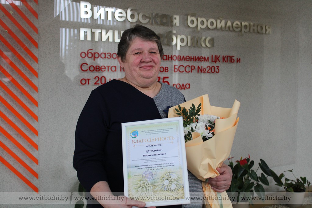На днях Мария Зеноновна отметила свой юбилей, в связи с чем принимала душевные поздравления и слова благодарности от представителей администрации и профкома родного предприятия, а также профсоюзного лидера аграриев Витебского района Инги Сергеевой. Юбилярше пожелали крепкого здоровья, оптимизма и всех благ, вручили подарки и цветы.