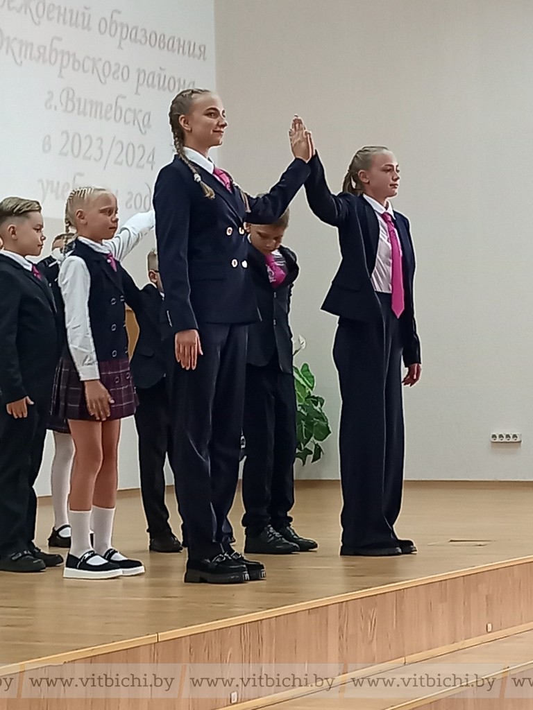 Под одобрительные аплодисменты в зале появились дети, которые продемонстрировали новую форму, теперь каждая школа будет иметь свой бренд. Новая форма призвана воспитывать в детях культуру, развивать вкус и серьезное отношение к дресс-коду.
