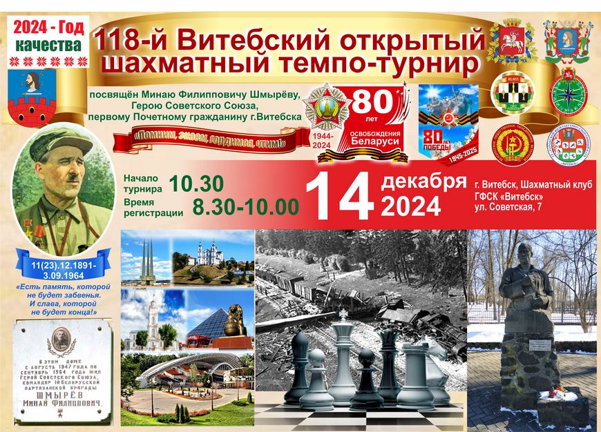 28 ноября /«Витьбичи»/. Открытый лично-командный шахматный турнир, посвященный Герою Советского Союза Минаю Филипповичу Шмыреву, пройдет 14 декабря.