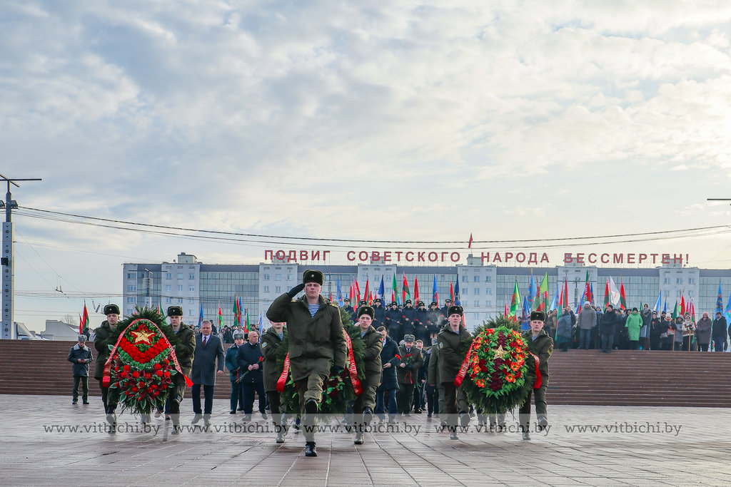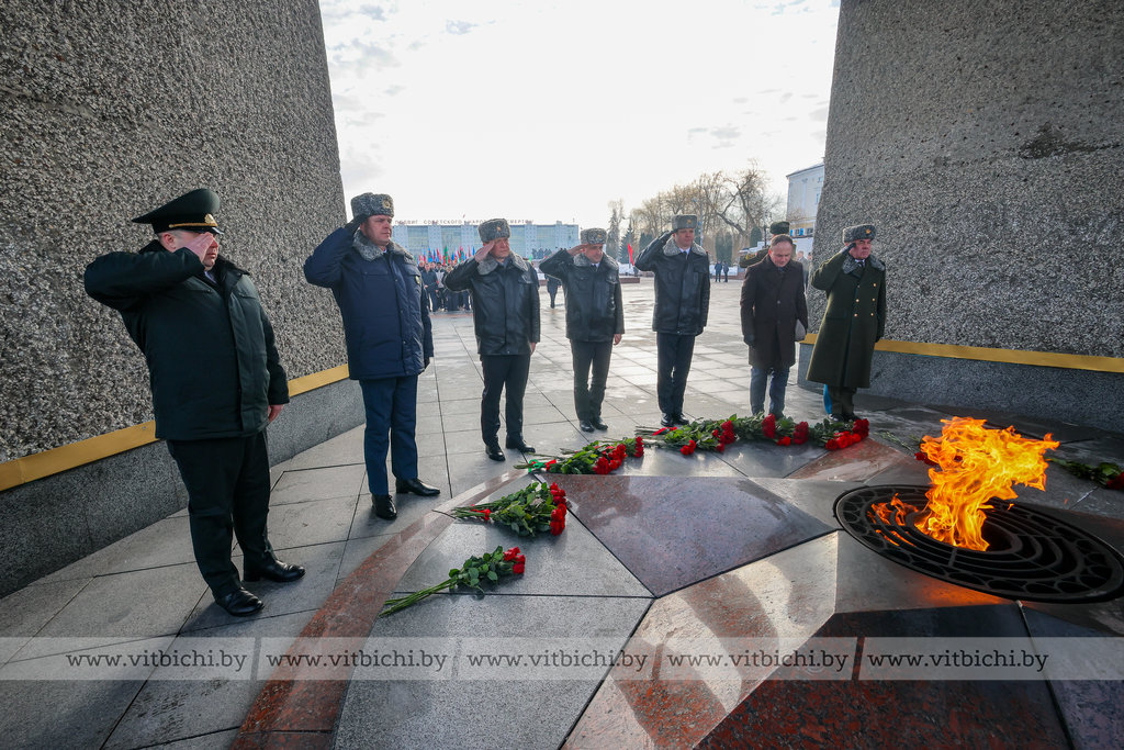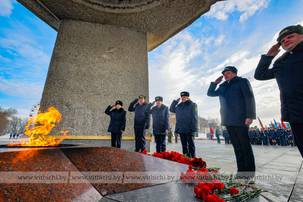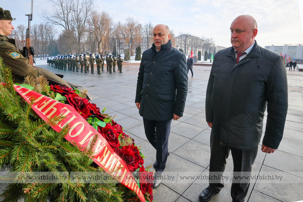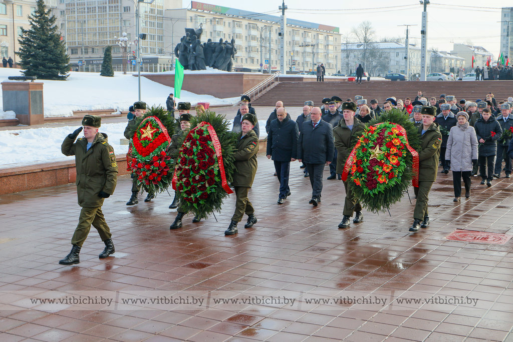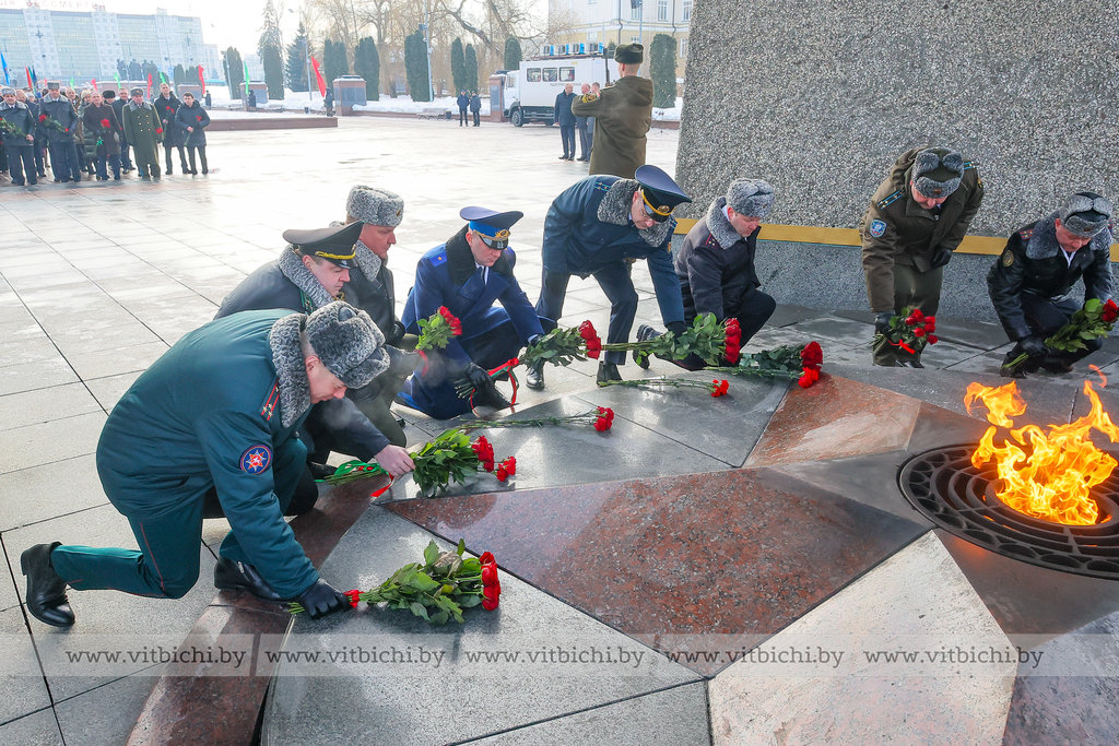На площади Победы в Витебске по случаю Дня защитников Отечества и Вооруженных Сил Республики Беларусь прошла торжественная церемония возложения венков и цветов к мемориальному комплексу, посвященному воинам-освободителям, партизанам и подпольщикам Витебщины.