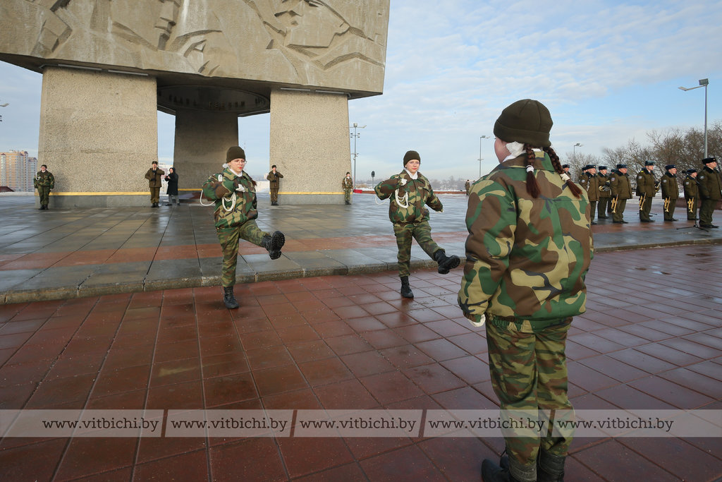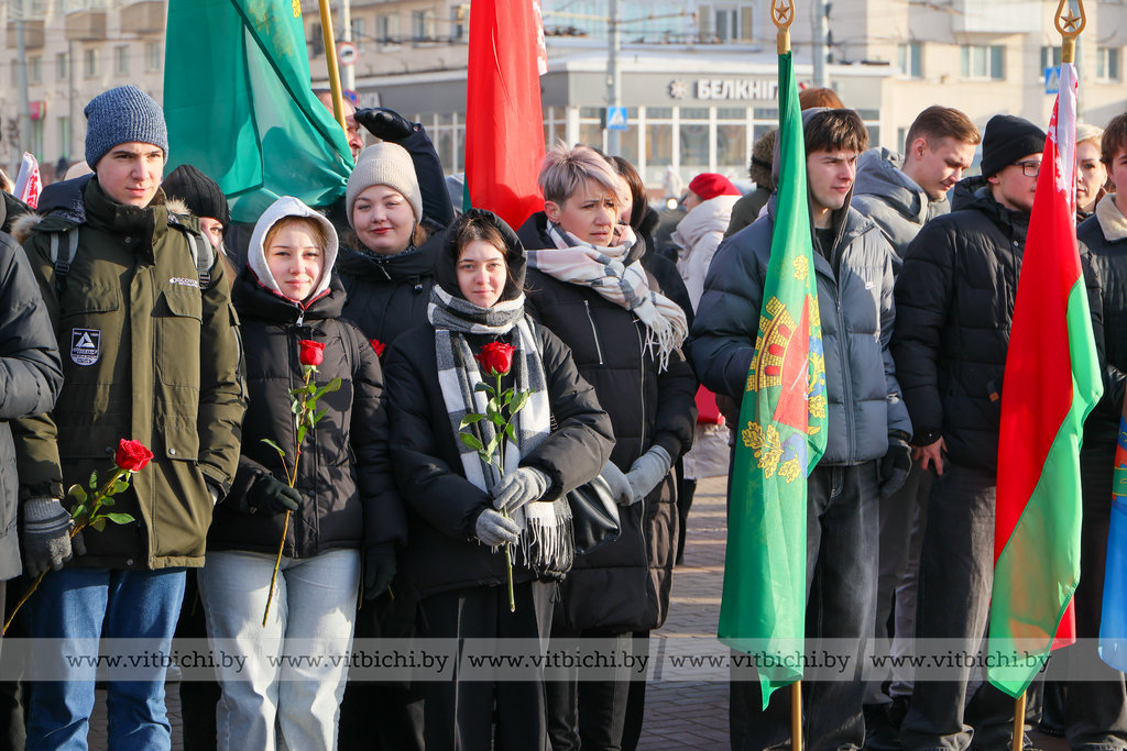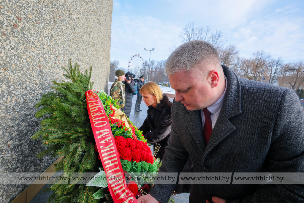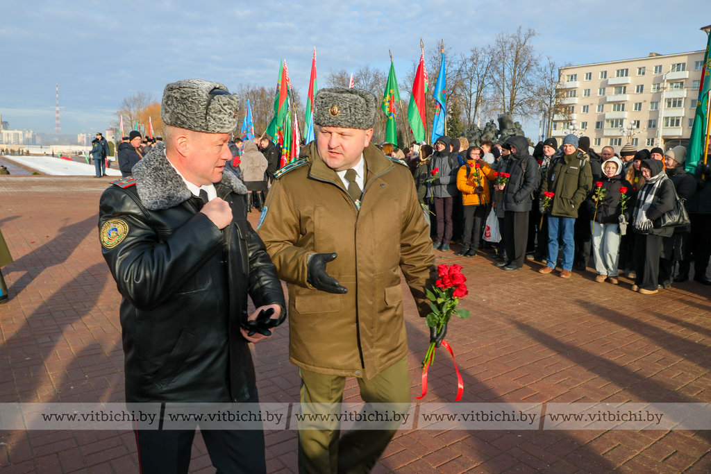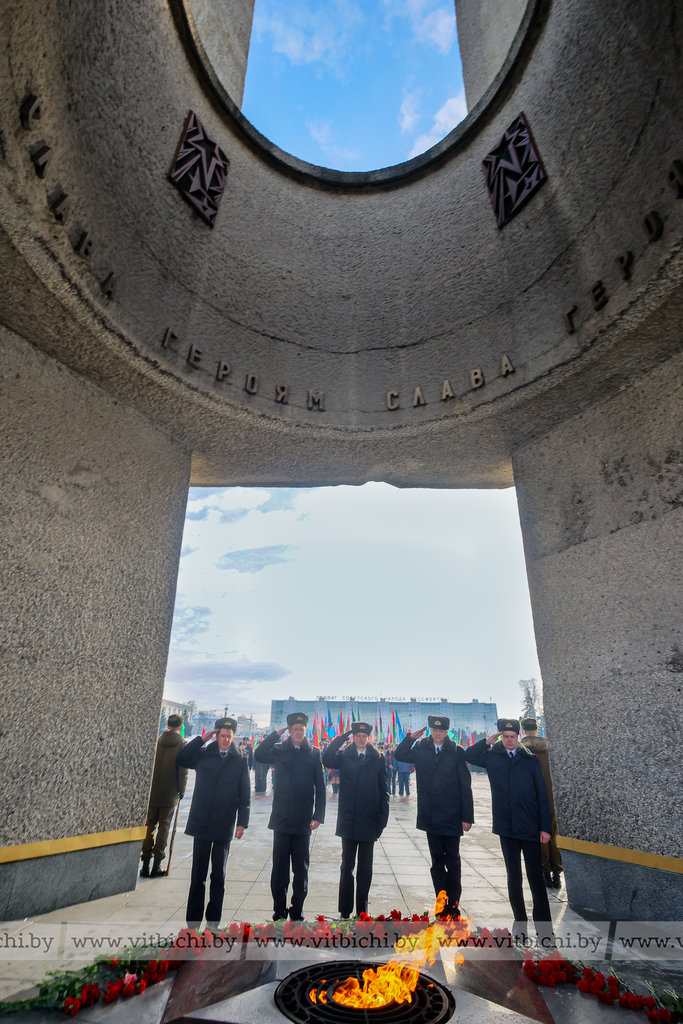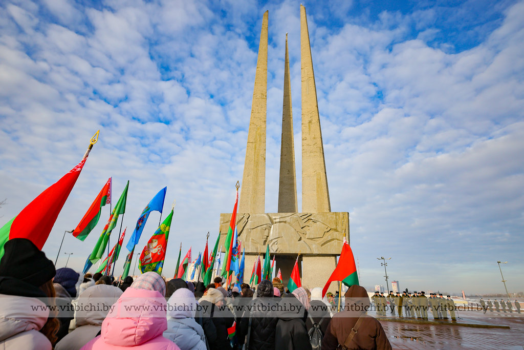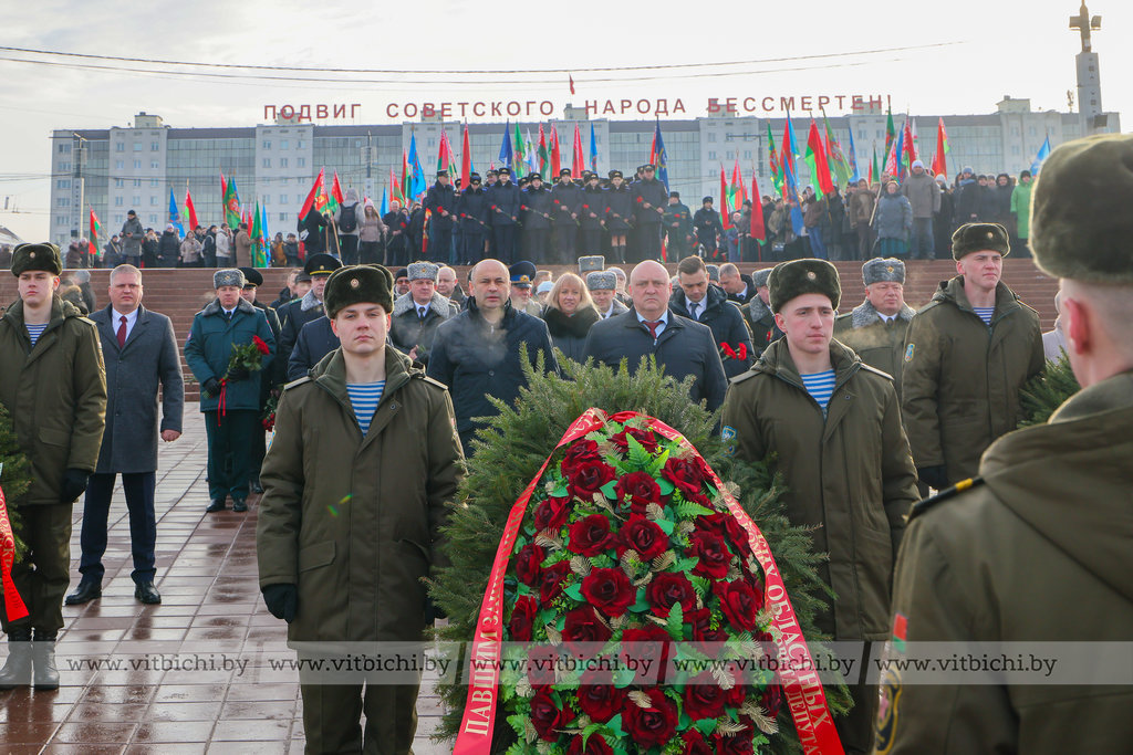 На площади Победы в Витебске по случаю Дня защитников Отечества и Вооруженных Сил Республики Беларусь прошла торжественная церемония возложения венков и цветов к мемориальному комплексу, посвященному воинам-освободителям, партизанам и подпольщикам Витебщины.