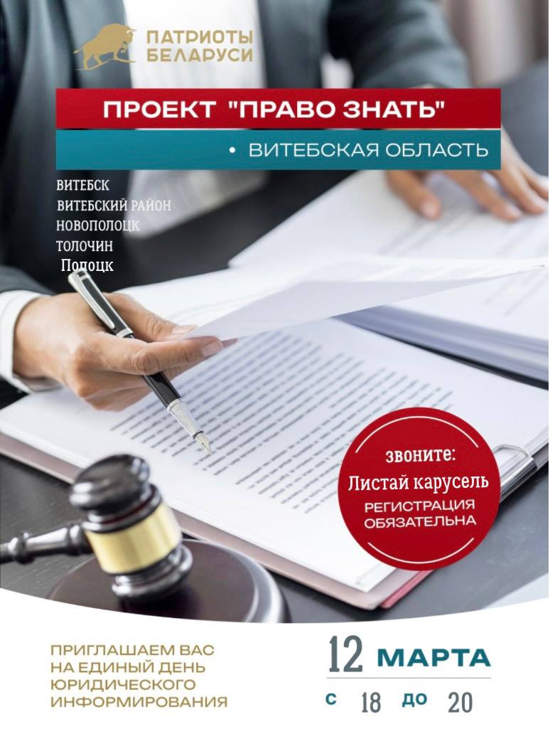 Республиканское общественное объединение «Патриоты Беларуси» объявляет о запуске масштабного социального проекта «Право знать», направленного на повышение правовой грамотности населения и обеспечение доступа к квалифицированной бесплатной юридической помощи по всей стране. Проект реализуется в партнерстве с Белорусской республиканской коллегией адвокатов, Минской городской коллегией адвокатов и при активной поддержке органов местной власти.