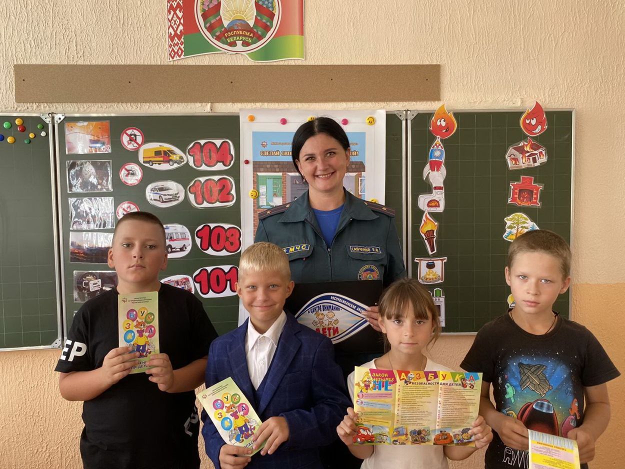 5 сентября / "Витьбичи" /. Спасатели Витебского района в рамках кампании «В центре внимания – дети» проводят жизненно важные уроки в учреждениях образования Придвинья.