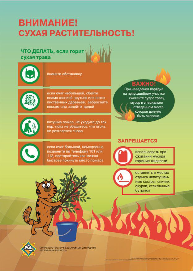 - не проходите мимо горящей травы, при невозможности потушить пожар своими силами, сообщайте о возгораниях в дежурную службу МЧС по телефонам 101, 112.