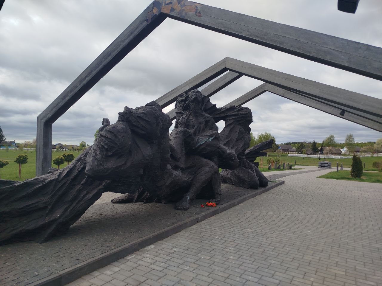 От мемориала с матерью идет дорога, ведущая к улице с обугленными срубами. Каждый сруб, как остатки чьей-то жизни, содержит воспоминания выживших детей и взрослых. Далее разворачивается композиция, напоминающая огонь и дым, образ разъяренной стихии, в которой находятся живые люди. Мы не можем представить себе их страдания, но в своем сознании мы ощущаем ужас той трагедии.