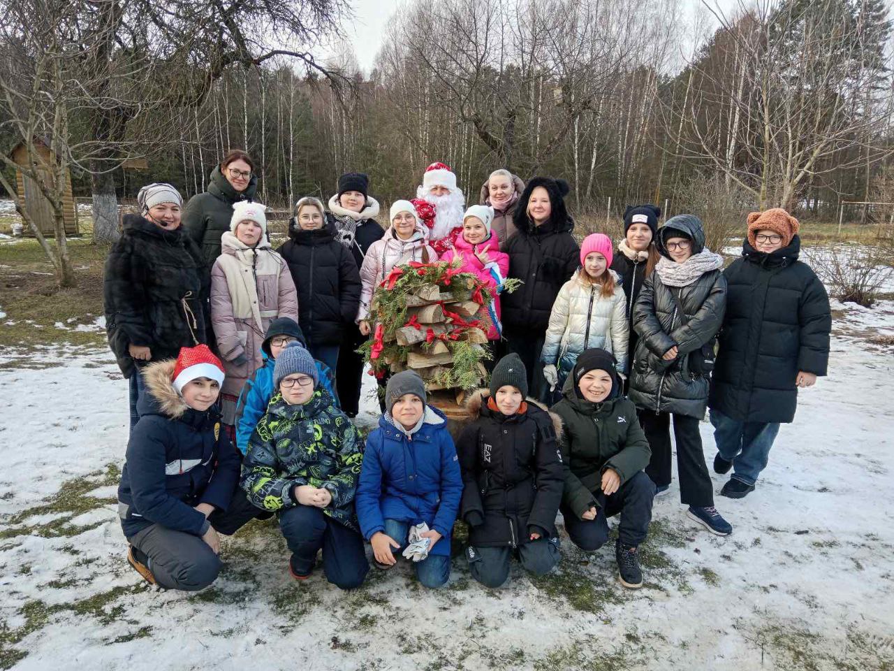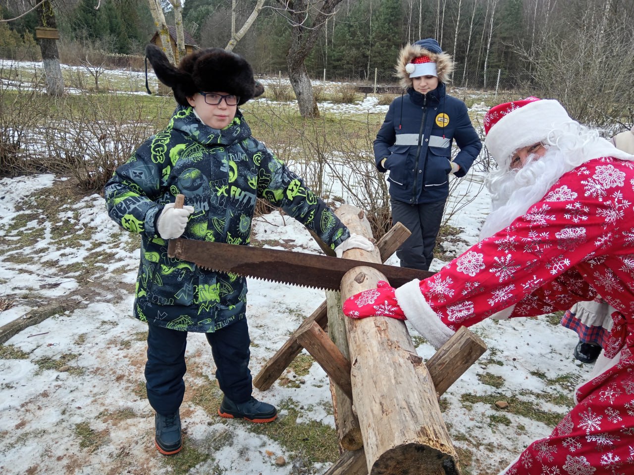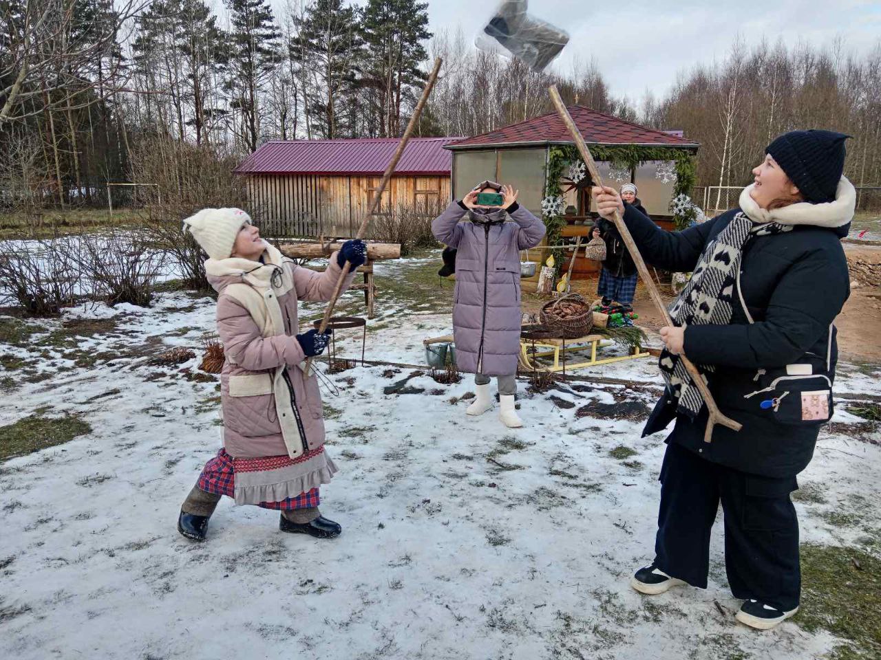 Затем школьники продолжили изучать быт Деда Мороза во дворе. Они узнали, как волшебник использует в хозяйстве древесину ели и сосны, поучились рубить и пилить дрова, носить ведра с помощью коромысла, проявили удаль и смекалку в боях мешками и дуэли на валенках. Вместе с Дедушкой они создали из поленьев «ёлку желаний», украсили ее бантами и цветами, не забыв поделиться своими мечтами. А чтобы они непременно исполнились, водили вокруг сказочной корзины хоровод по старинным народным традициям.