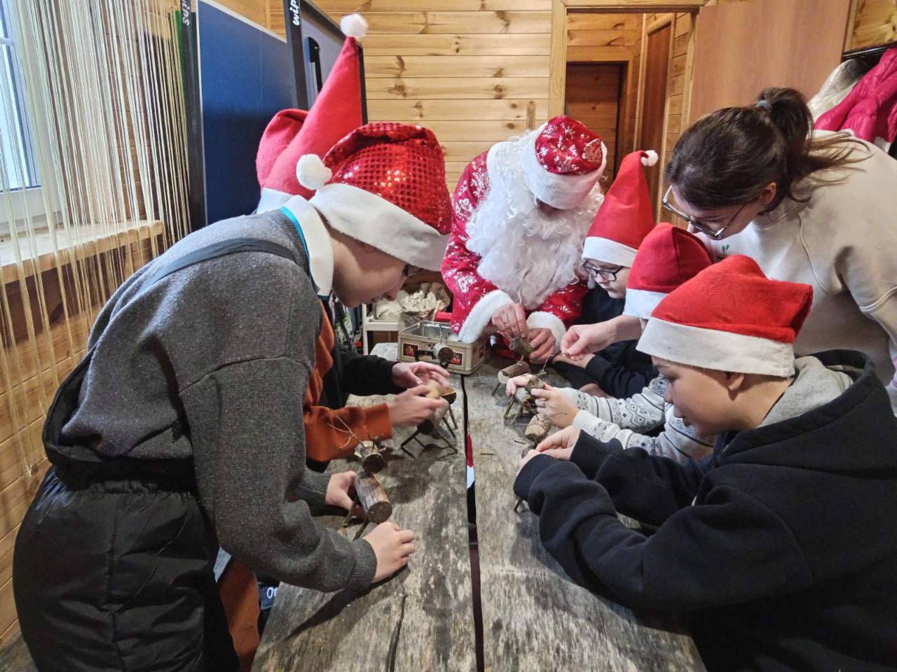 А сколько интересного они увидели в его сказочном тереме! К примеру, дети с удовольствием посидели на кровати с соломенным матрасом, полюбовались лоскутным одеялом ручной работы и узнали секрет волшебных подушек: их обязательно должно быть семь (по количеству дней в неделе), чтобы уместились все желания детей. Также ребята научились считать на калькуляторе Деда Мороза (деревянных счетах), зажигать керосиновую лампу. Девочки приняли участие в мастер-классе по созданию морозных узоров, а мальчики сделали деревянных оленей.