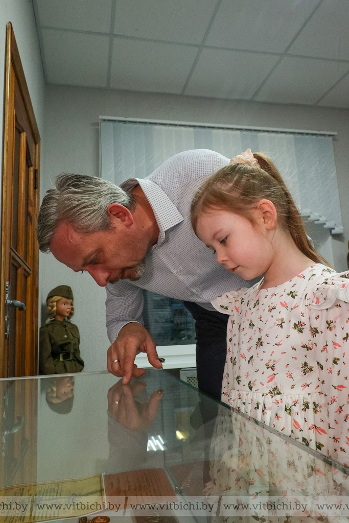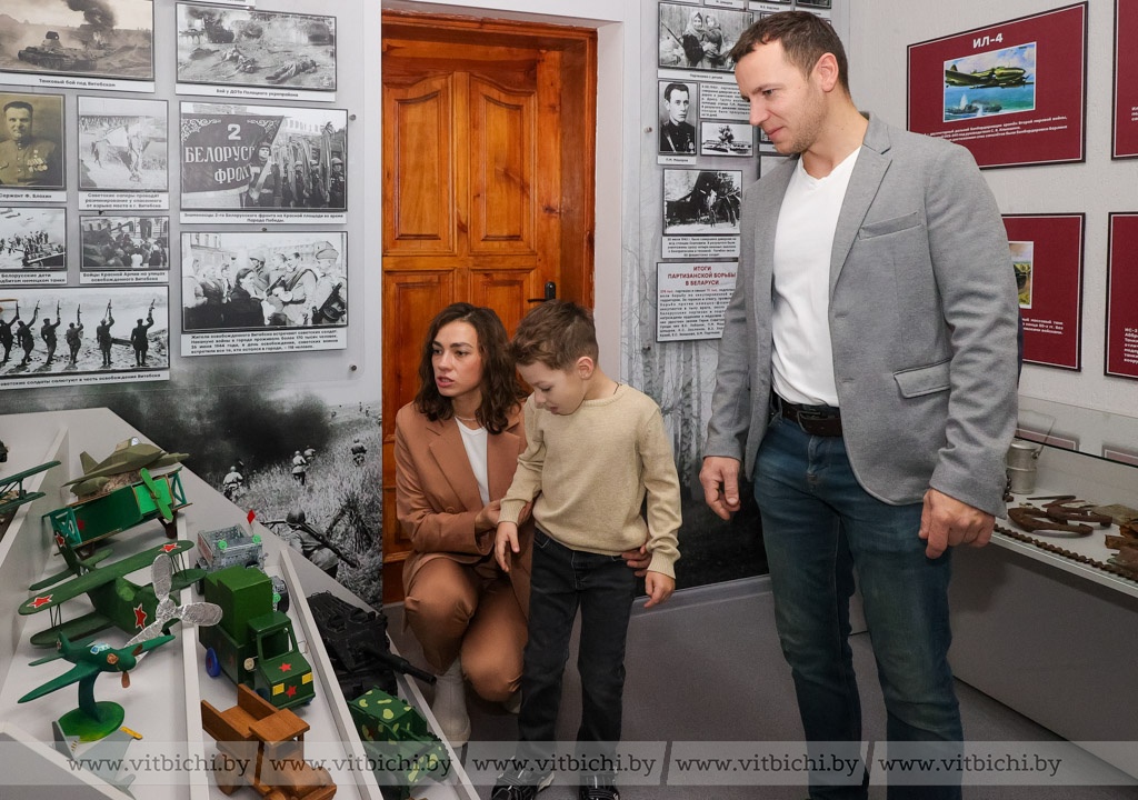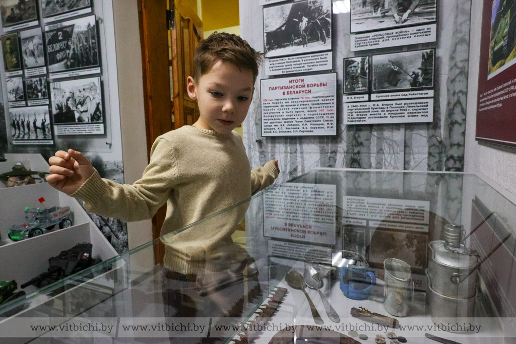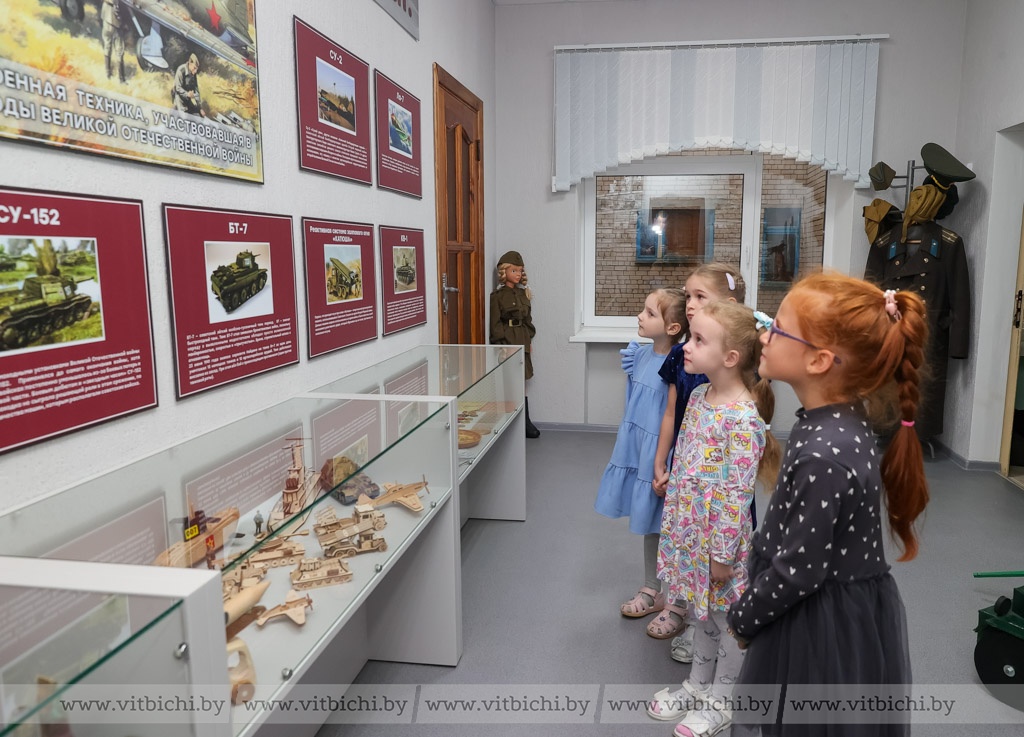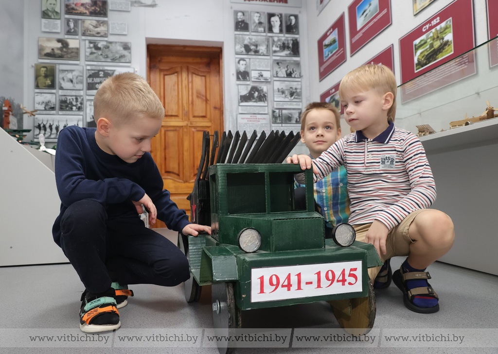 Чуть более полугода назад в дошкольном учреждении образования появилась музейная экспозиция «Боевая техника военных лет». В ней представлены макеты боевых машин, изготовленные воспитанниками детских садов Первомайского района вместе с родителями и педагогами, стенды с информацией о событиях, которые происходили в Витебске в годы Великой Отечественной войны, о партизанском движении в нашем регионе. Есть здесь и предметы, найденные поисковиками во время раскопок: каски, фляжки, ложки и многое другое.