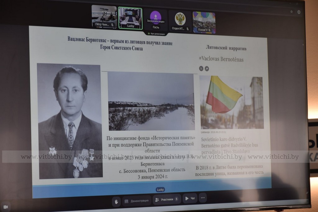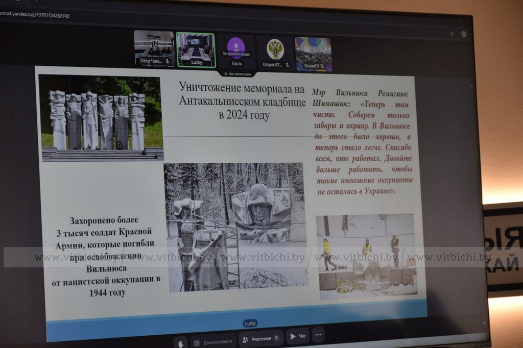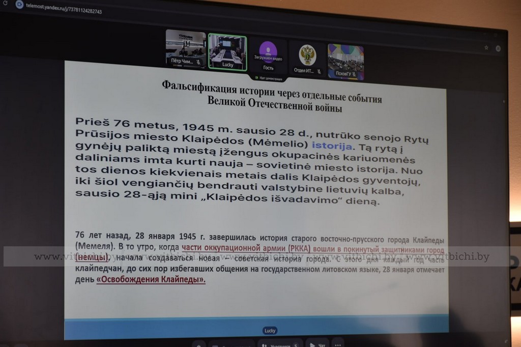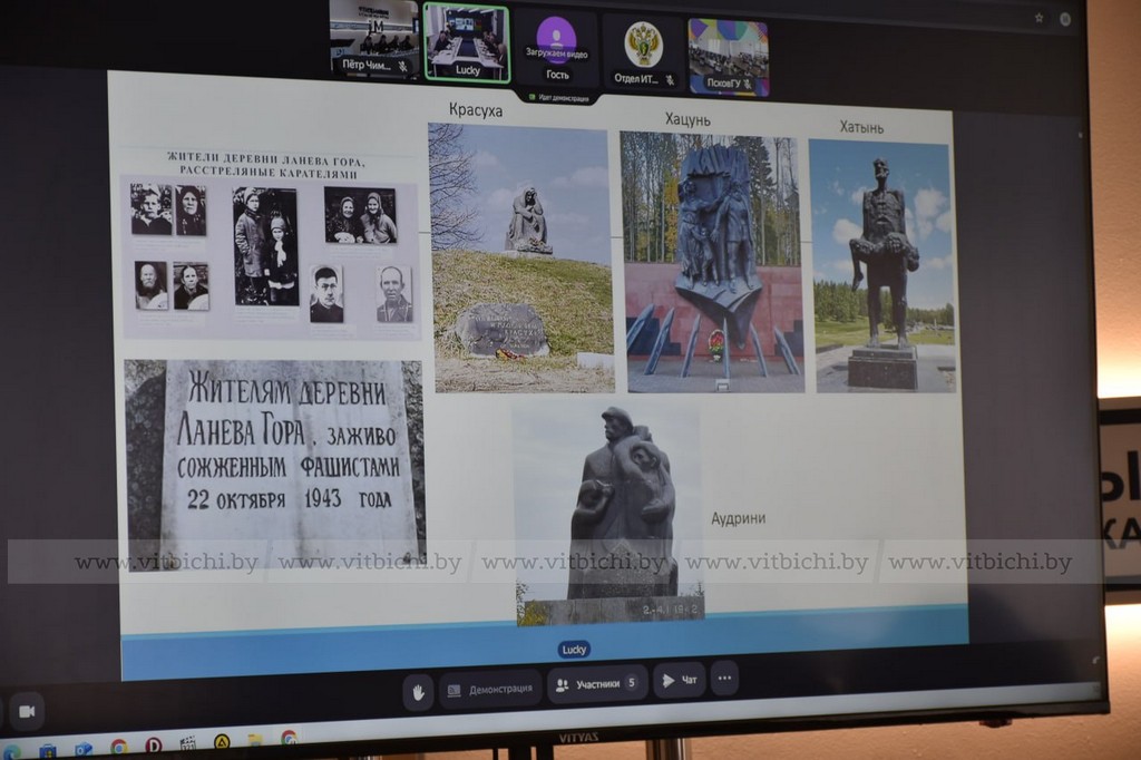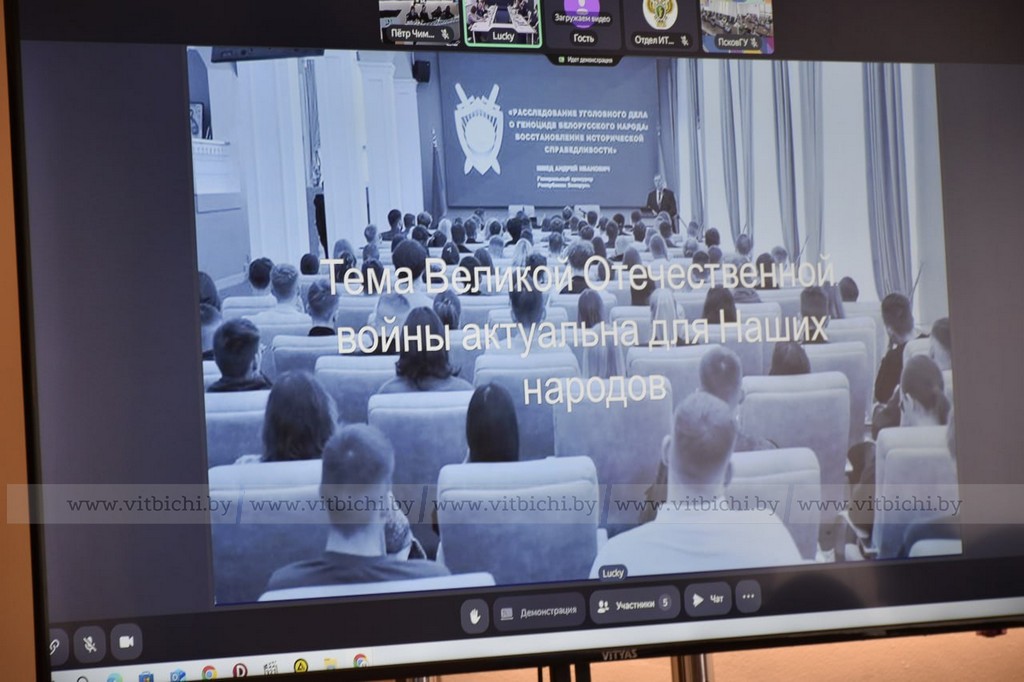 29 мая / «Витьбичи» / Виталий Сеньков /. Рабочую встречу, в том числе в режиме видеоконференции, провели сотрудники прокуратуры Витебской и Псковской областей. Главная тема встречи – обмен опытом в расследовании фактов геноцида советского народа в годы Великой Отечественной войны, противодействии реабилитации нацизма, в работе по сохранению исторической памяти и справедливости.
