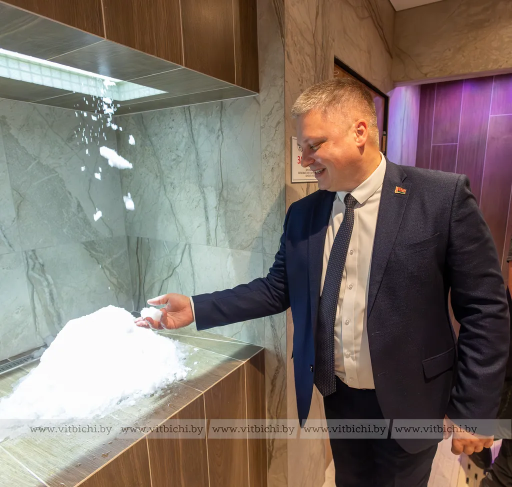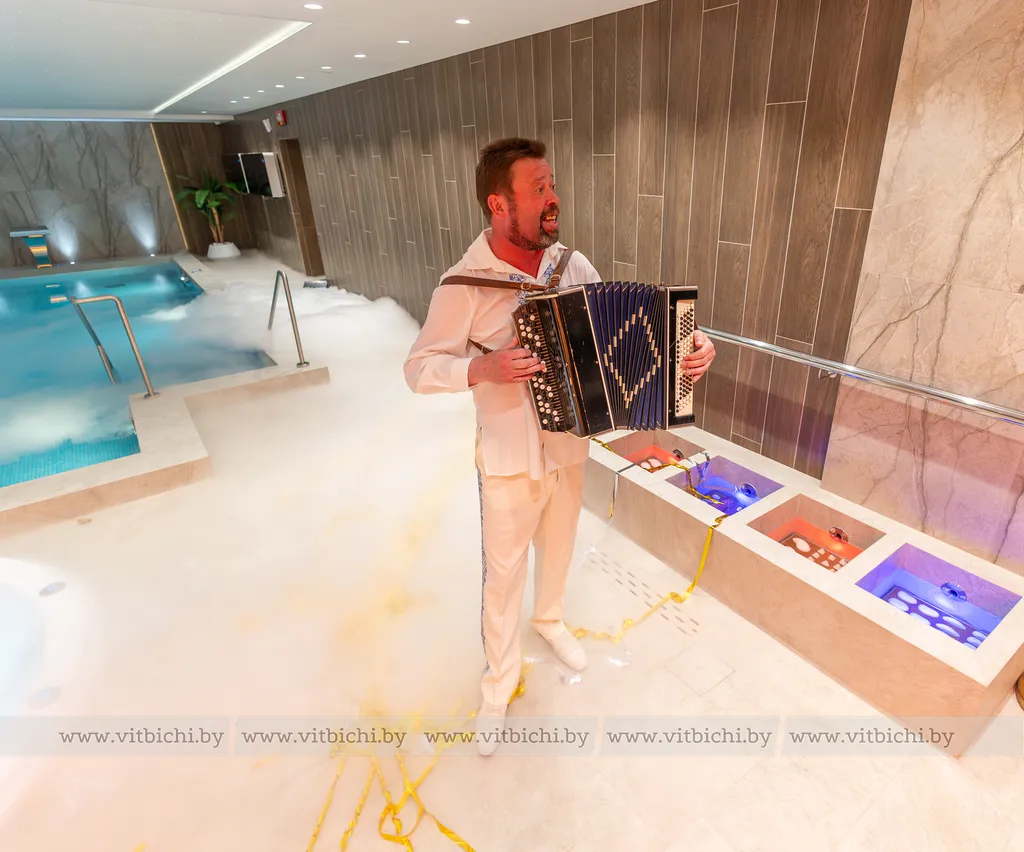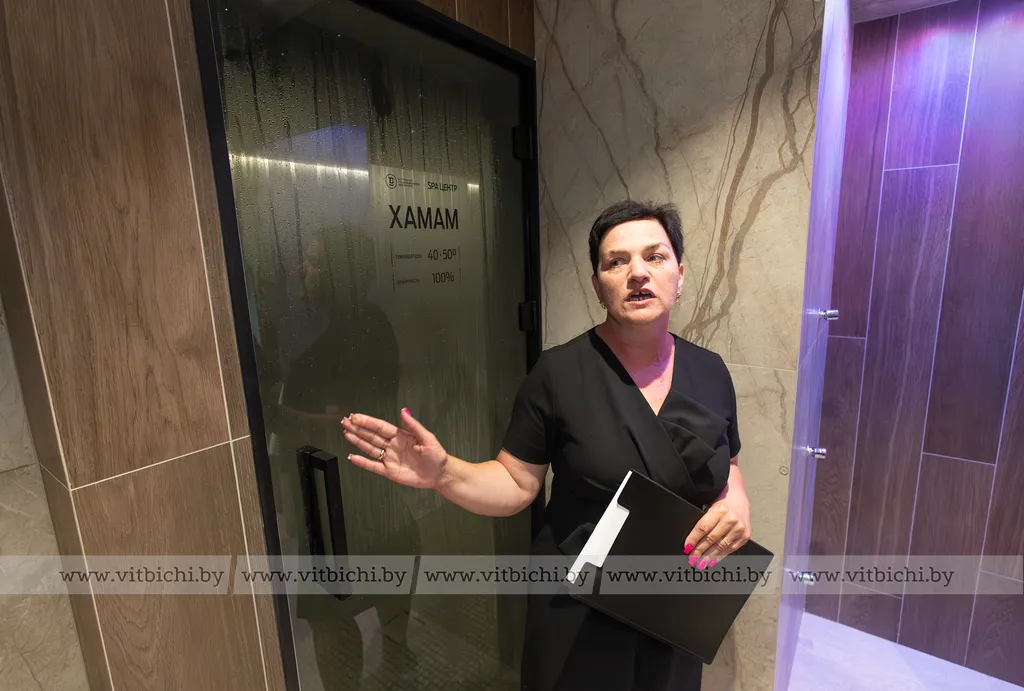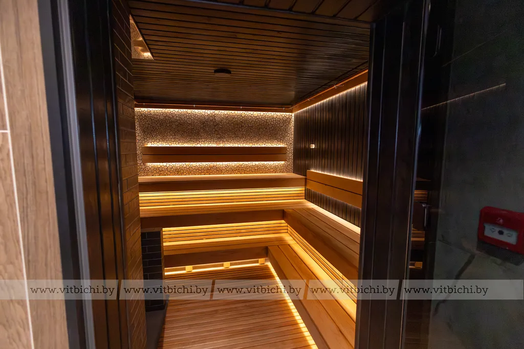 В том, что комплекс для отдыха и оздоровления действительно получился, гости убедились, осмотрев его основные локации. Здесь уже все наполнено здоровым духом, паром и яркими световыми эффектами. Три вида бань (финская, хаммам, инфракрасная комната), бассейн и джакузи, массажная дорожка Кнейпа, солнечная комната с оздоровительной гималайской солью и 15 световыми режимами, оздоровительные души, зона отдыха – все к услугам посетителей.