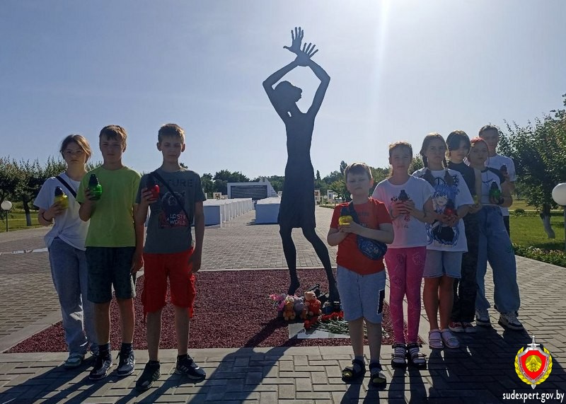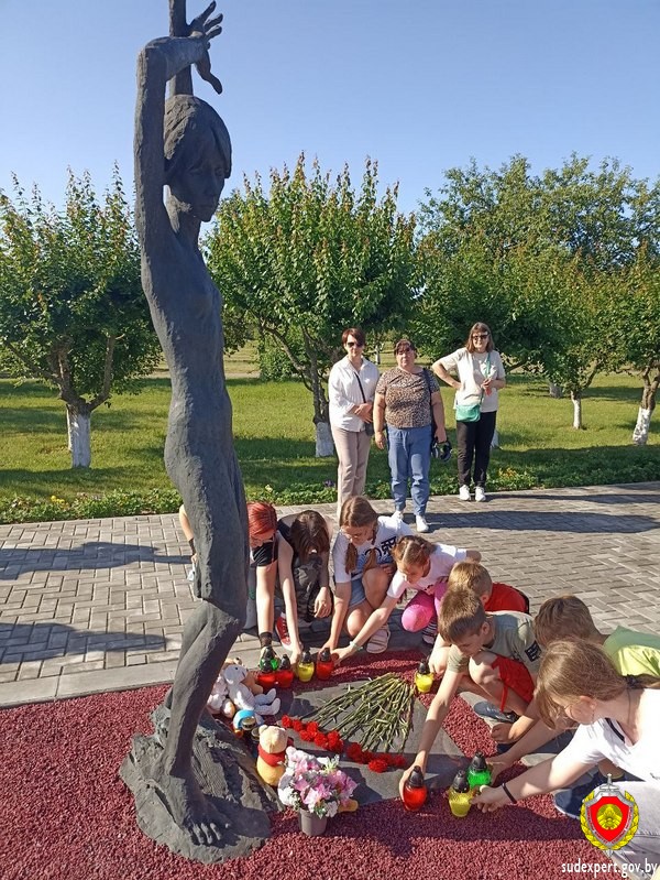 Началась экскурсия с мемориального комплекса «Красный Берег», посвященного детям, погибшим в годы Великой Отечественной войны. Этот памятник скорби не имеет аналогов и получил название «Детская Хатынь». Здесь располагался один из крупнейших детских донорских концлагерей. В нем содержались дети в возрасте от 8 до 14 лет, которых насильно отнимали у матерей из близлежащих районов. У детей брали кровь, а тех, кто оставался жив, увозили на каторжные работы в Германию.