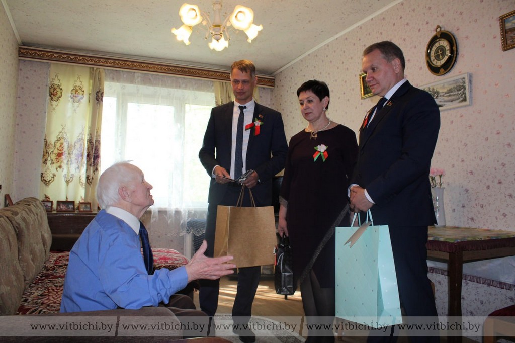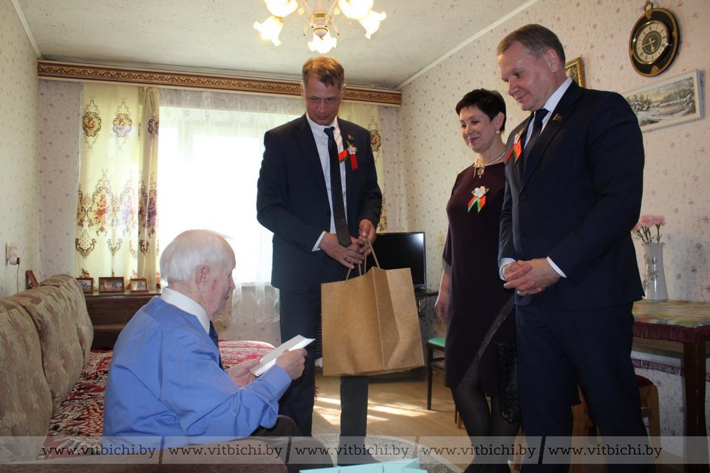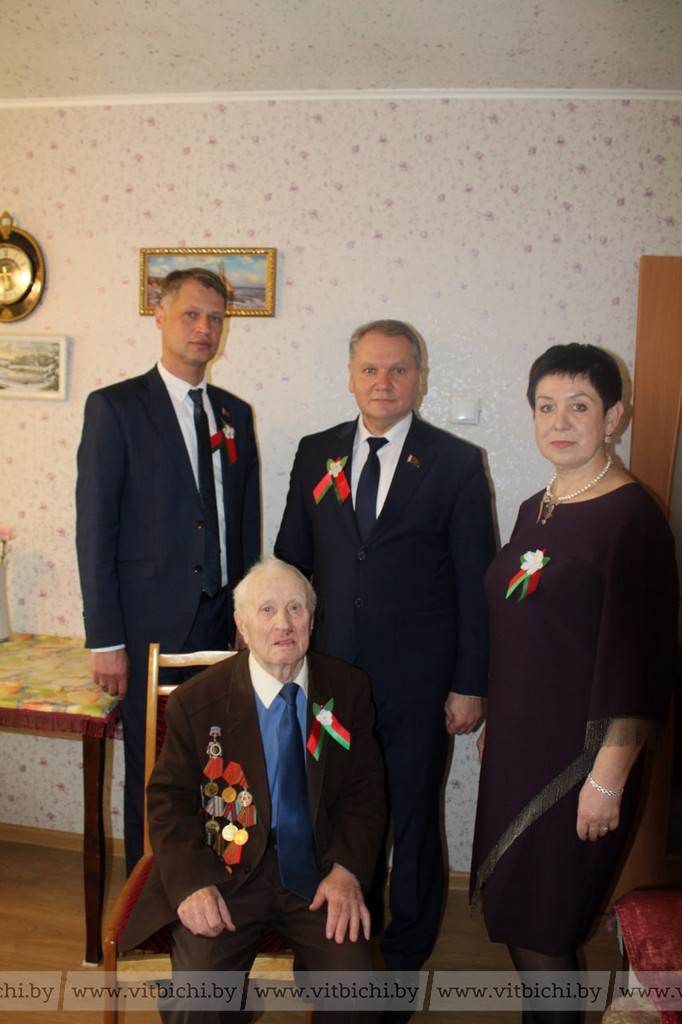 Депутат Палаты представителей Национального собрания Республики Беларусь, председатель Постоянной комиссии по промышленности, топливно-энергетическому комплексу, транспорту и связи Юрий Панфилов, глава администрации Октябрьского района г. Витебска Владимир Белевич и директор Территориального центра социального обслуживания населения Октябрьского района г. Витебска Татьяна Ромашова поздравили с Днём Победы участника трудового фронта Василия Федоровича Маметьева.
