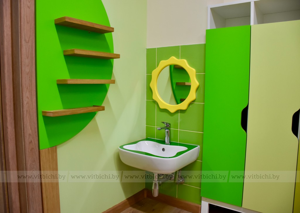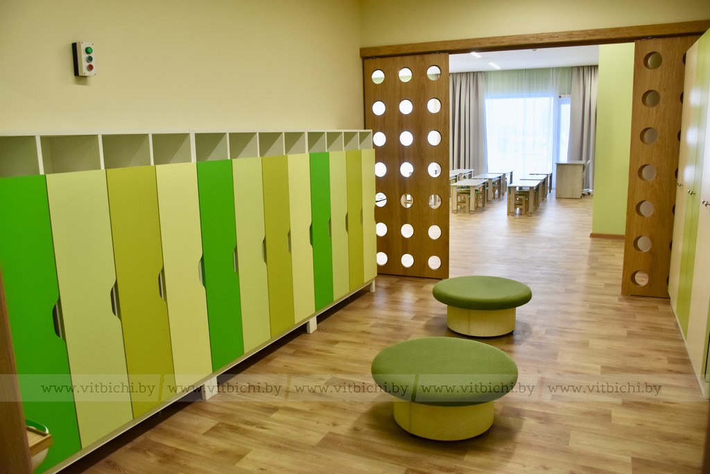 В детском саду все продумано до мелочей: панорамные окна от потолка до пола, раздвижные двери, очистка воздуха, телевизоры, музыкальные центры, удобная и экологичная мебель белорусского производства. Даже персональные шкафчики, в которых ребята будут хранить одежду, выполнены с подогревом. Что очень удобно зимой, когда надо успеть высушить варежки и шапки в перерывах между прогулками.