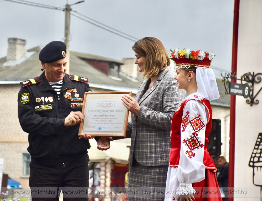 Представителям фонда Российско-Белорусского сотрудничества "Белые Росы" и Всероссийской общественной организации морских пехотинцев "Тайфун" вручили сертификат на передачу памятных знаков (камней-валунов) для их установки на Кубани в места подвигов россиян и белорусов во время Великой Отечественной войны.