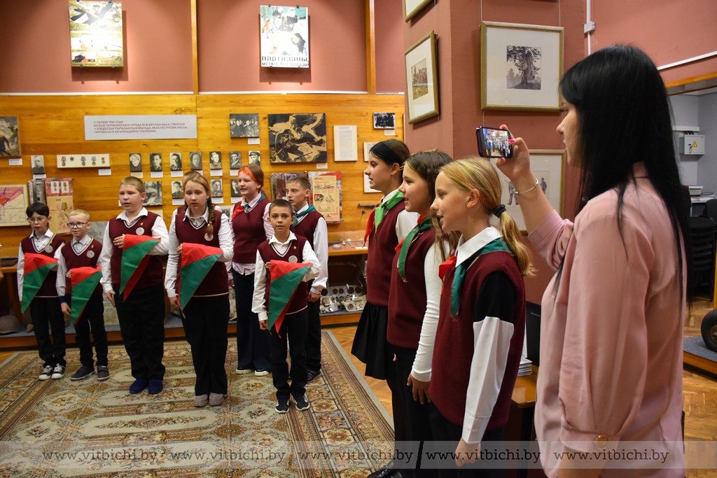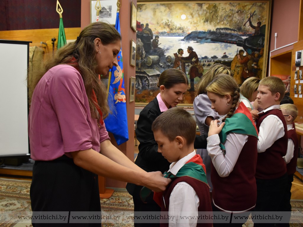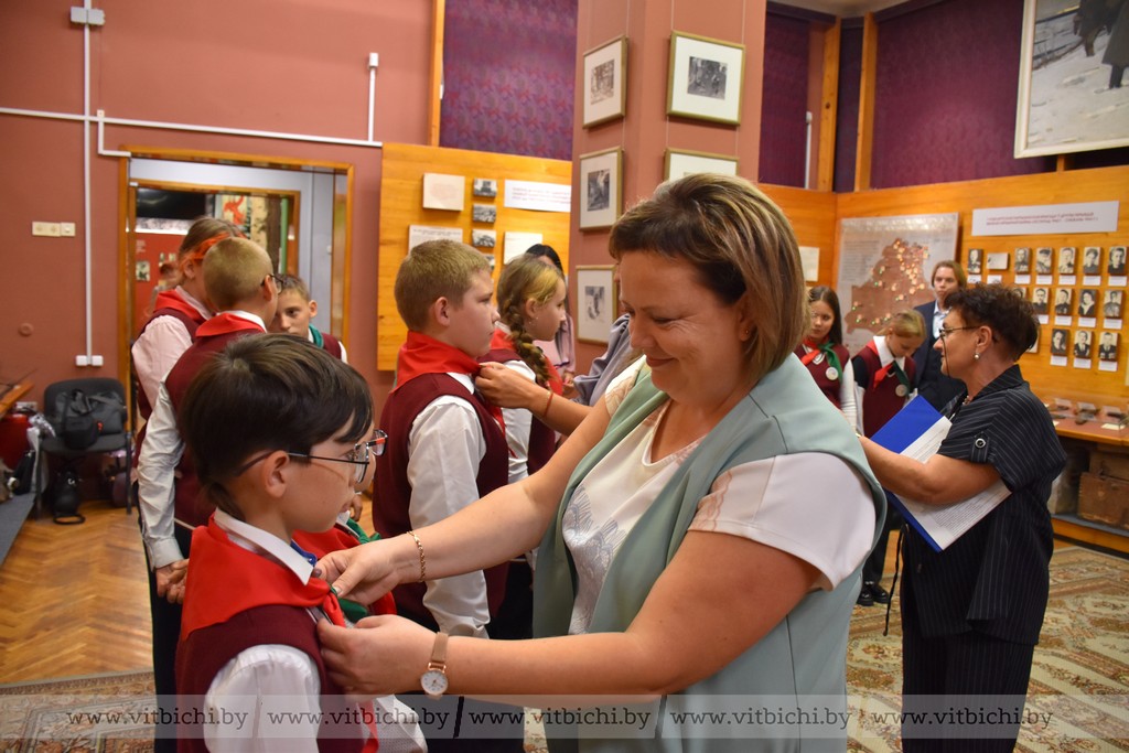 13 сентября / "Витьбичи" / Александр Пукшанский/. Сегодня в день рождения Белорусской республиканской пионерской организации в Витебском областном музее Героя Советского Союза М. Ф. Шмырёва приняли в пионерию пять пятиклассников из Суйковской базовой школы Витебского района.