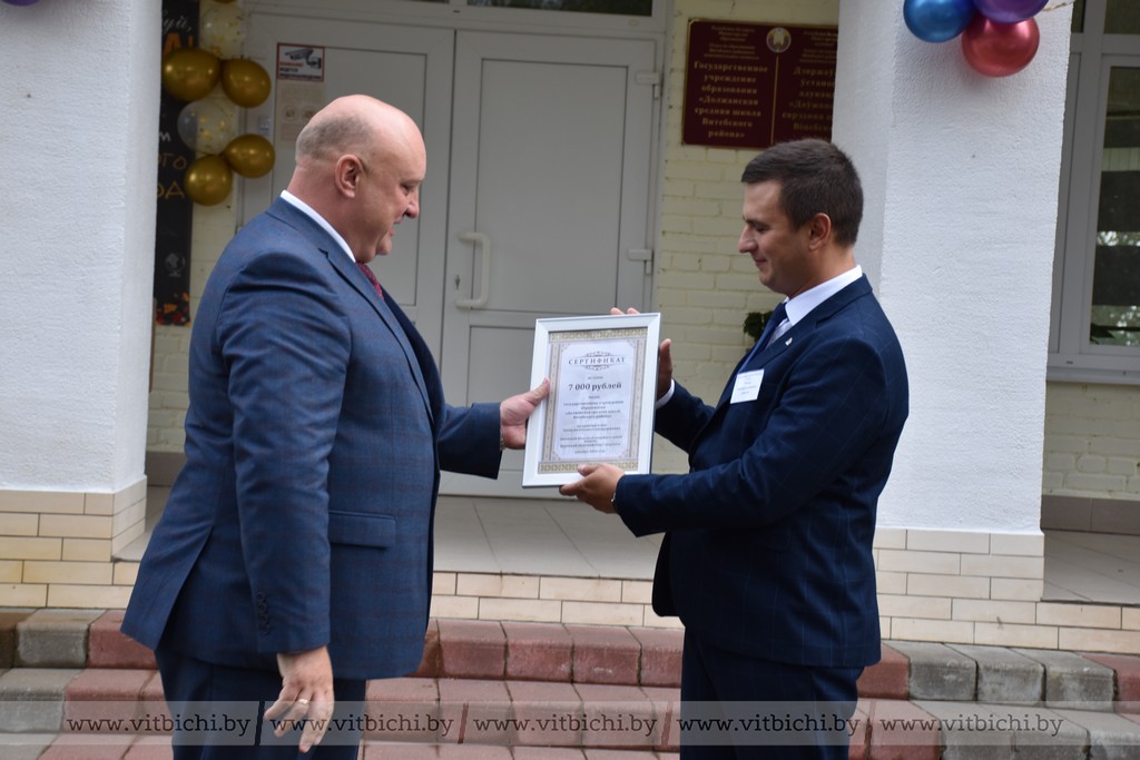 2 сентября/ "Витьбичи"/ Александр Пукшанский/. Два сертификата на приобретение технологического оборудования на общую сумму 17 тысяч рублей от Витебского областного Совета депутатов и Витебского райисполкома были вручены на торжественной линейке Должанской средней школе Витебского района.