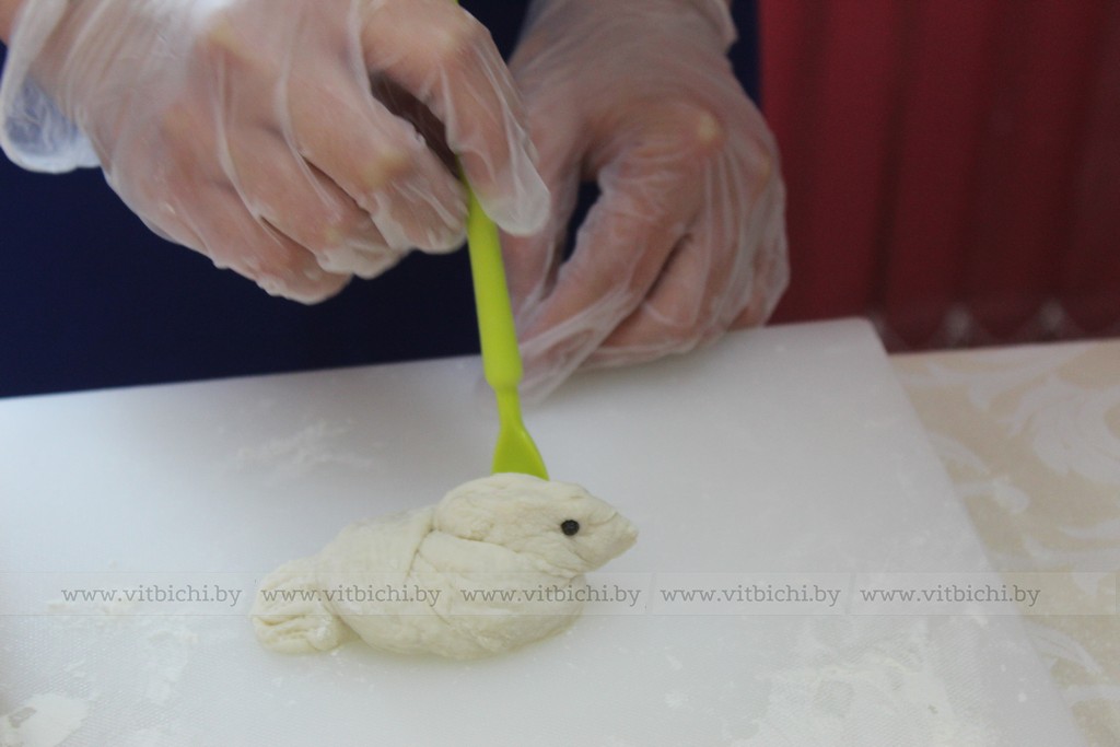 Работу с постным тестом, изготовление весенних сдобных жаворонков в традициях восточнославянской обрядности продемонстрировали мастер производственного обучения Юлия Рысева и учащиеся Городокского государственного аграрно-технического колледжа, рекламируя профессию «Обслуживание и изготовление продукции в общественном питании. Торговое обслуживание».