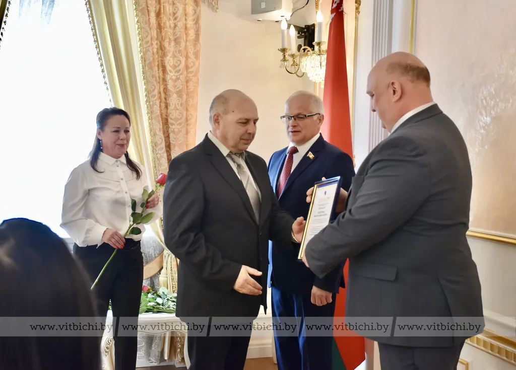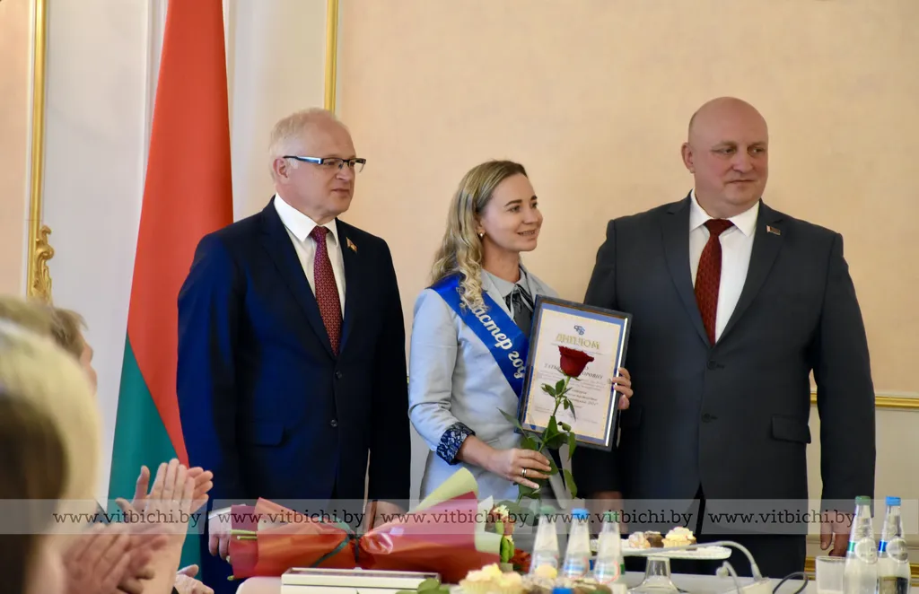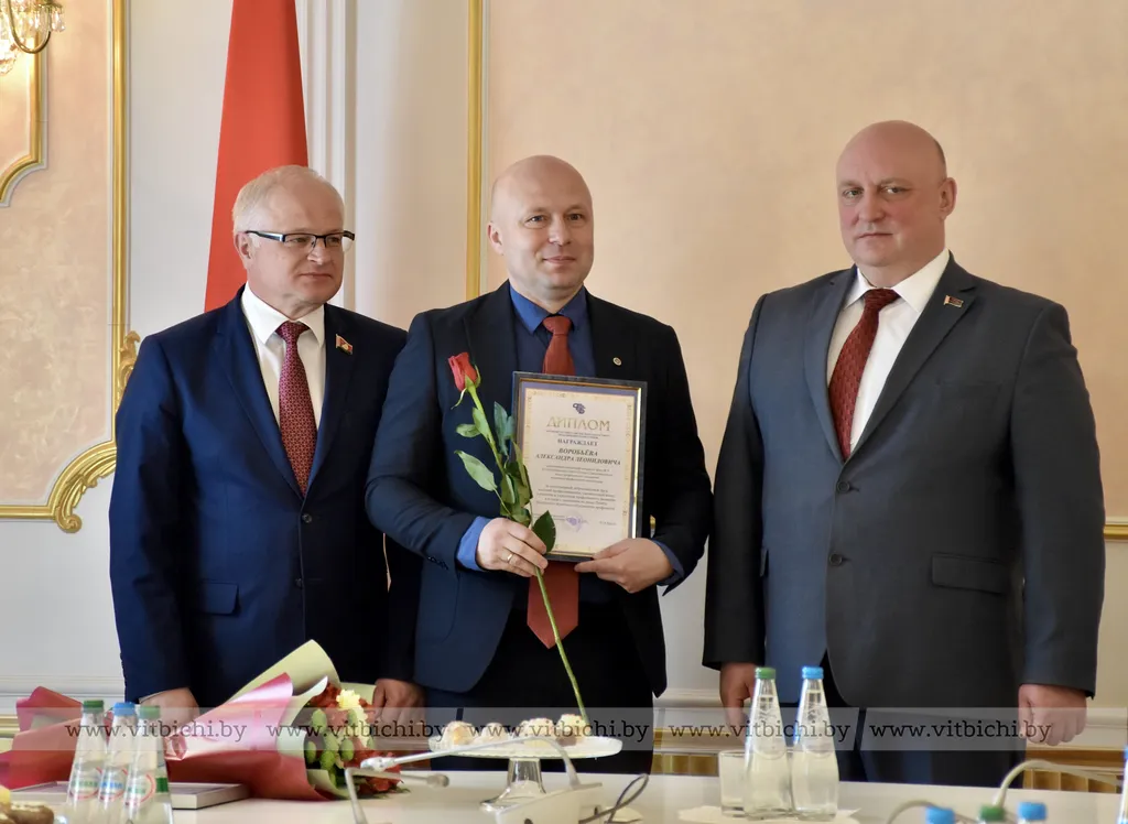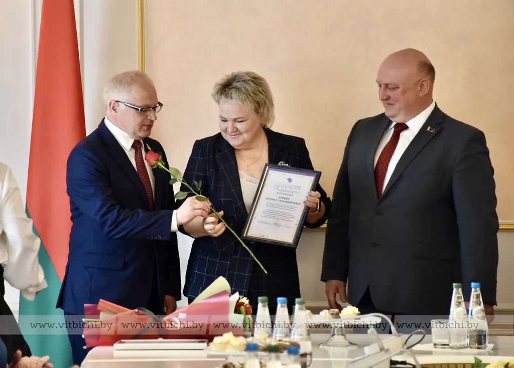 Дмитрий Демидов и председатель Витебского областного объединения профсоюзов Юрий Деркач вручили награды 17 лауреатам конкурса – работникам образования, здравоохранения, сельского хозяйства, торговли, строительства, газовой и топливной промышленности, энергетики, нефтехимической и других отраслей.